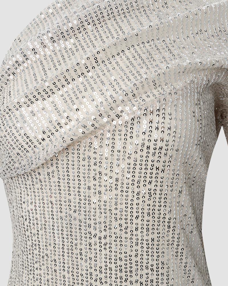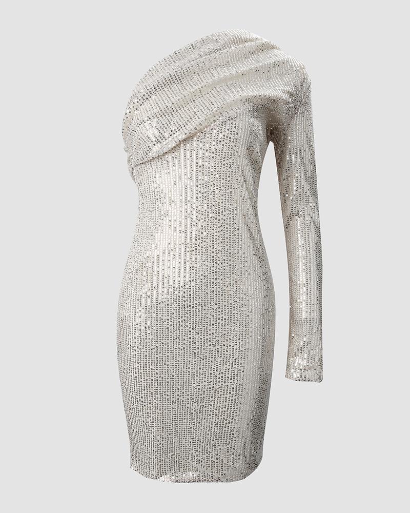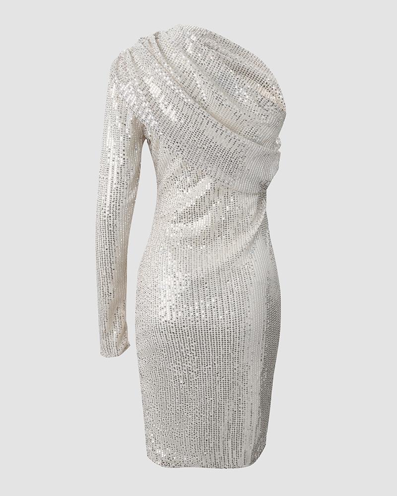 One Shoulder Long Sleeve Allover Sequins Dress