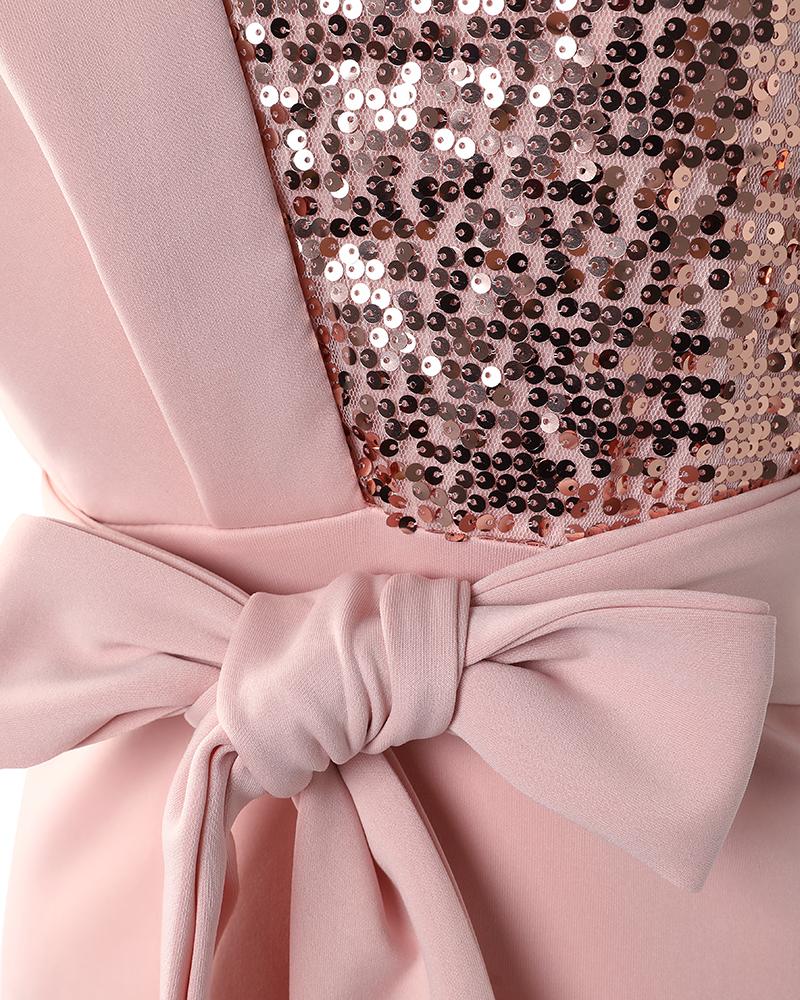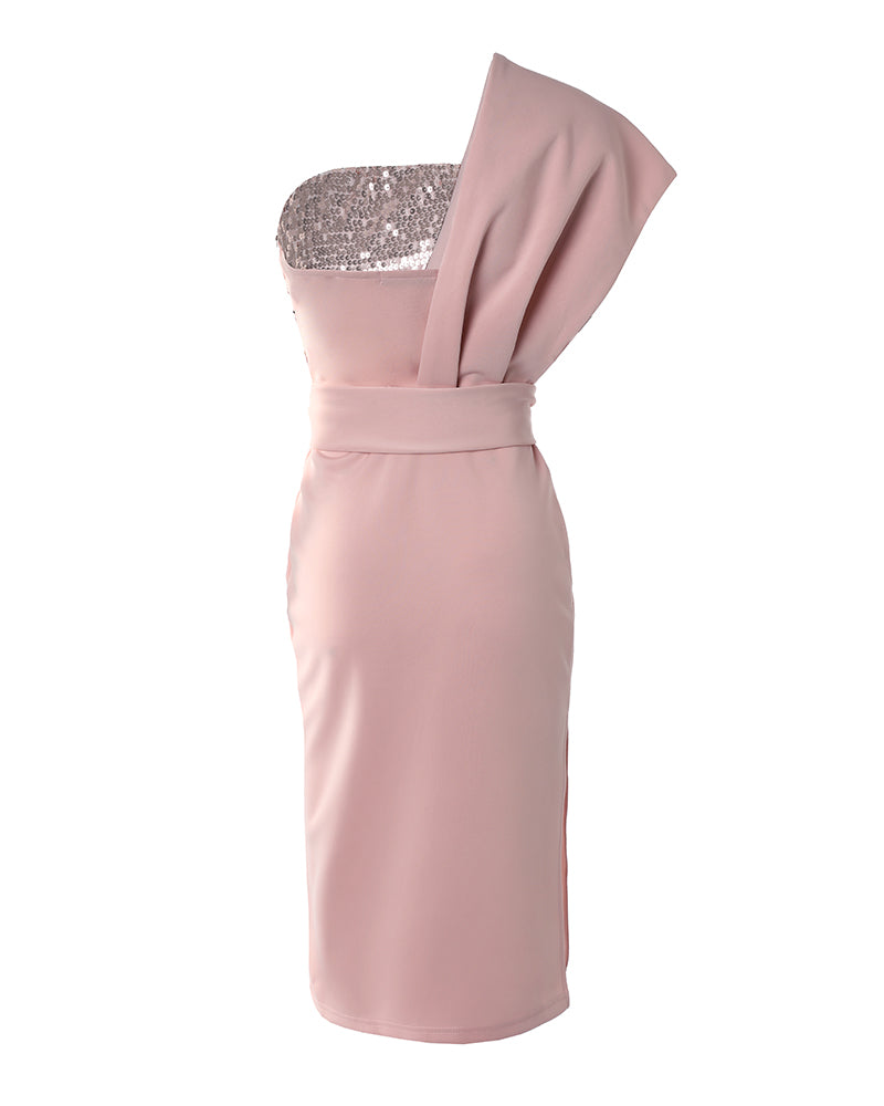 One Shoulder Slit Ruffle Hem Sequins Party Dress