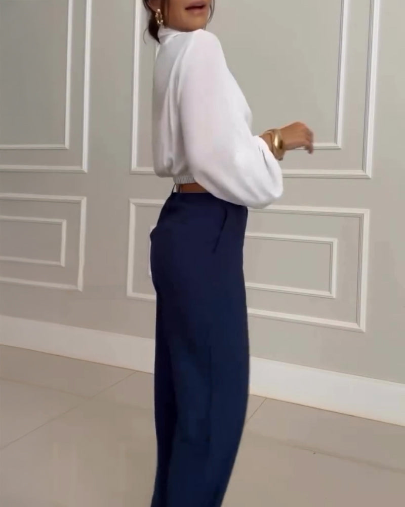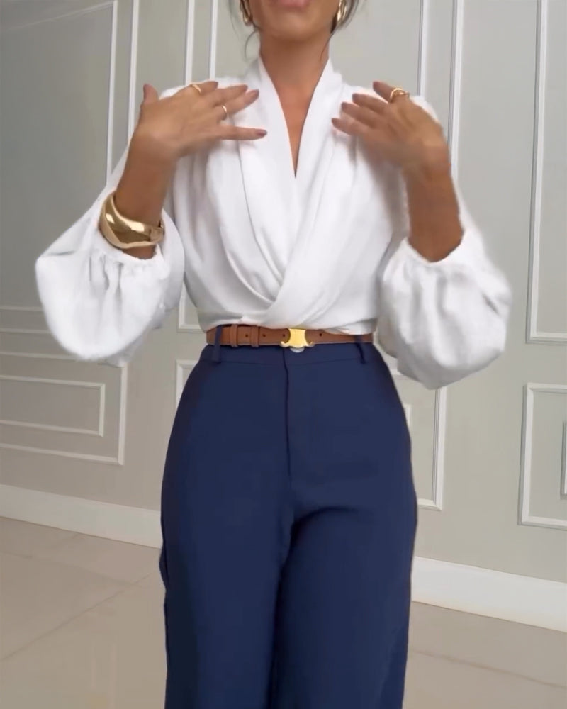 Overlap V Neck Lantern Sleeve Padded Shoulders 2 In 1 Blouse Casual Ruched Elastic Hem Crop Top