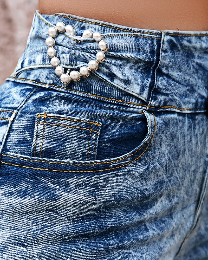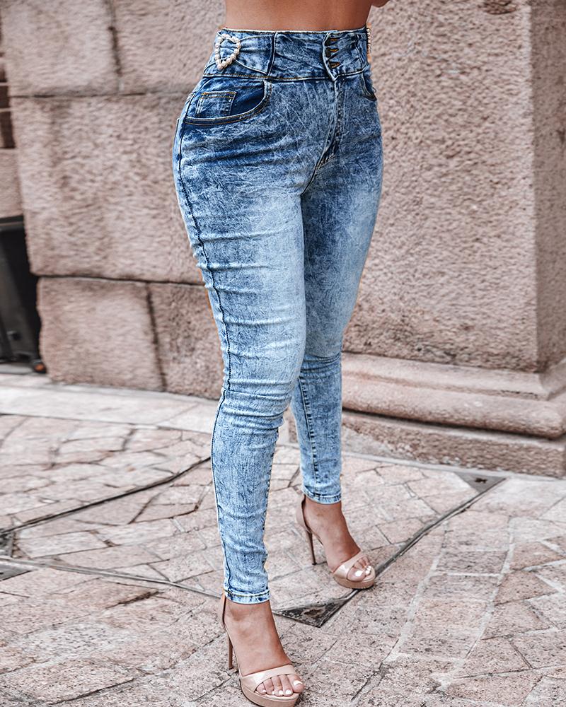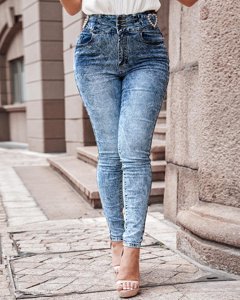 Pearls Decor Buttoned High Waist Skinny Jeans