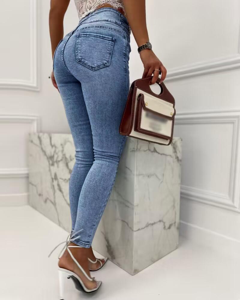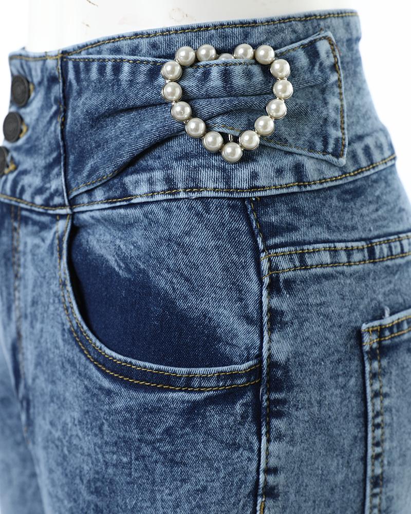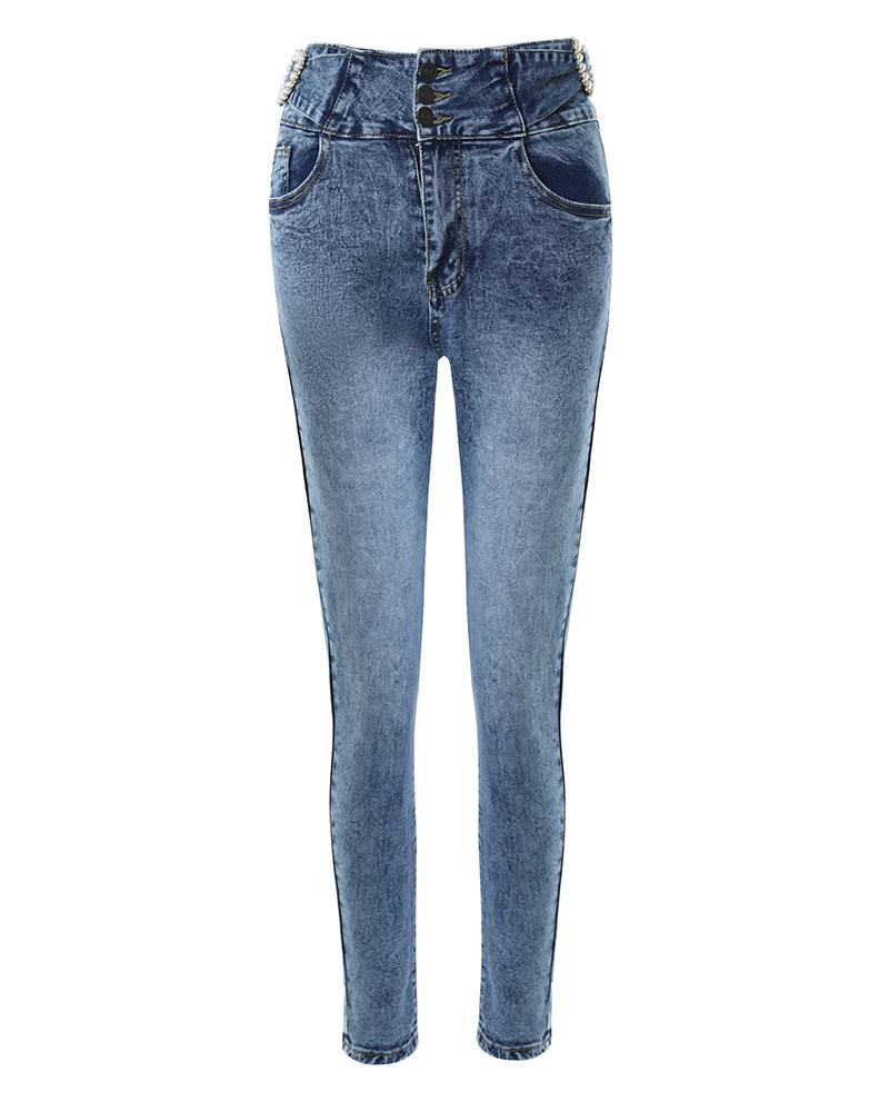 Pearls Decor Buttoned High Waist Skinny Jeans