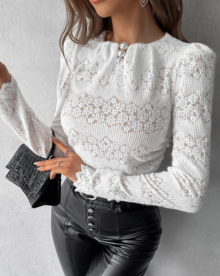 Pearls Decor Contrast Lace Puff Sleeve Top