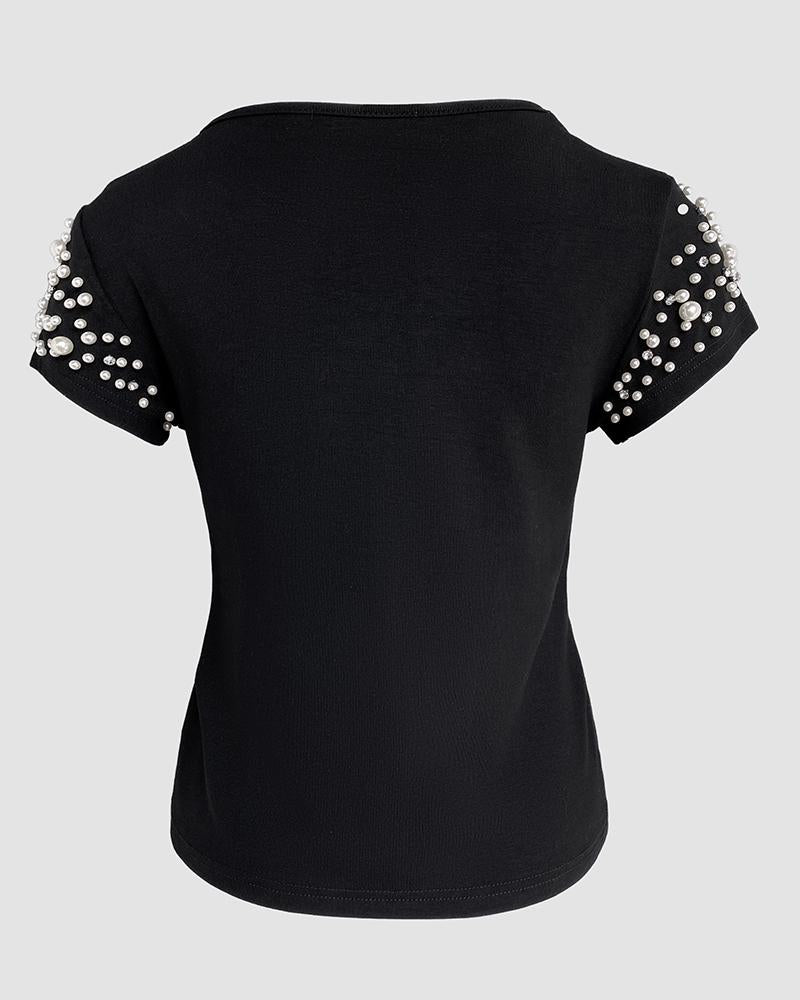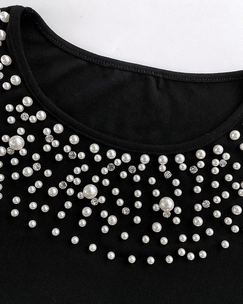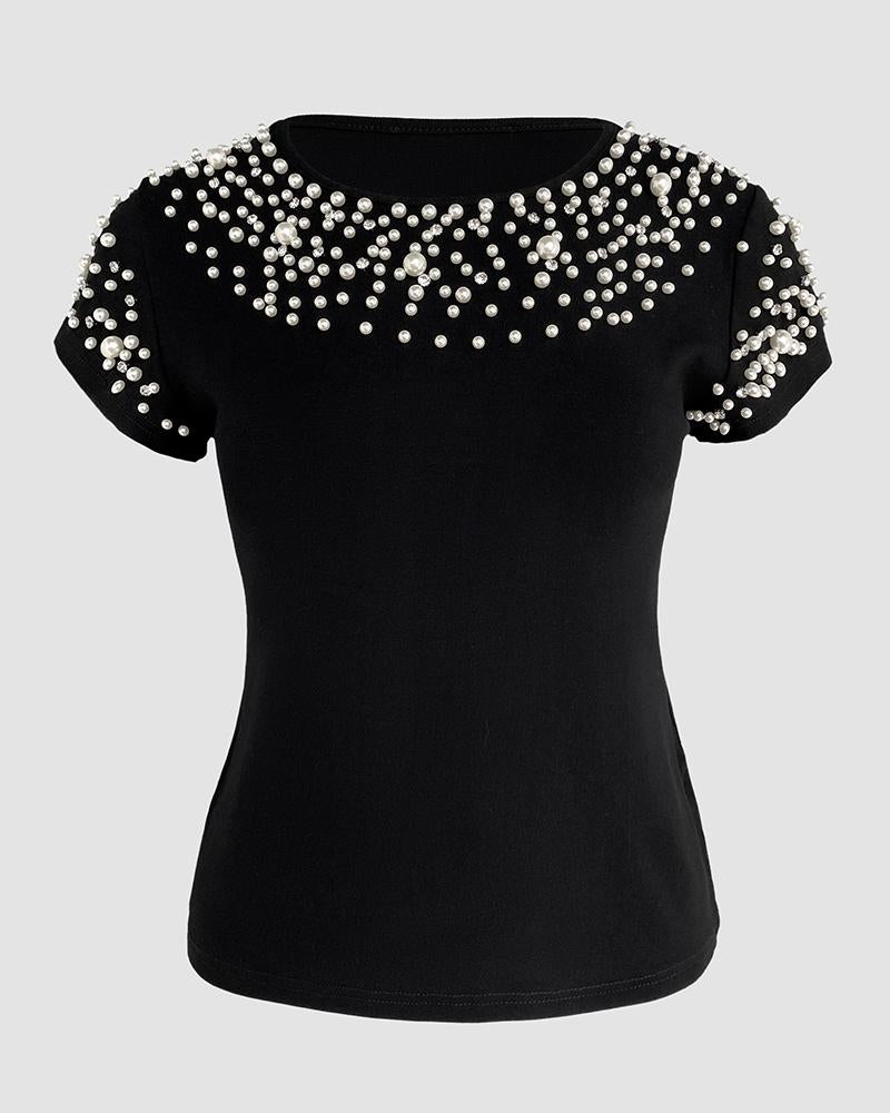 Pearls Decor Round Neck Short Sleeve T Shirt Casual Slim Fit Crop Top