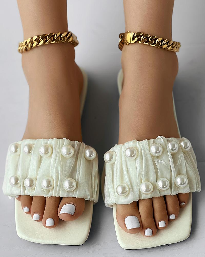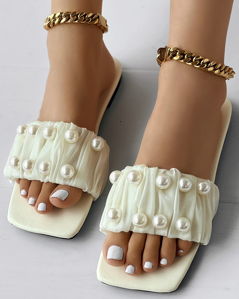 Pearls Decor Ruched Slippers Open Toe Summer Sandals
