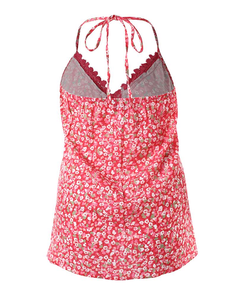 Pink Ditsy Floral Print Hollow Out Lace Trim Halter Top