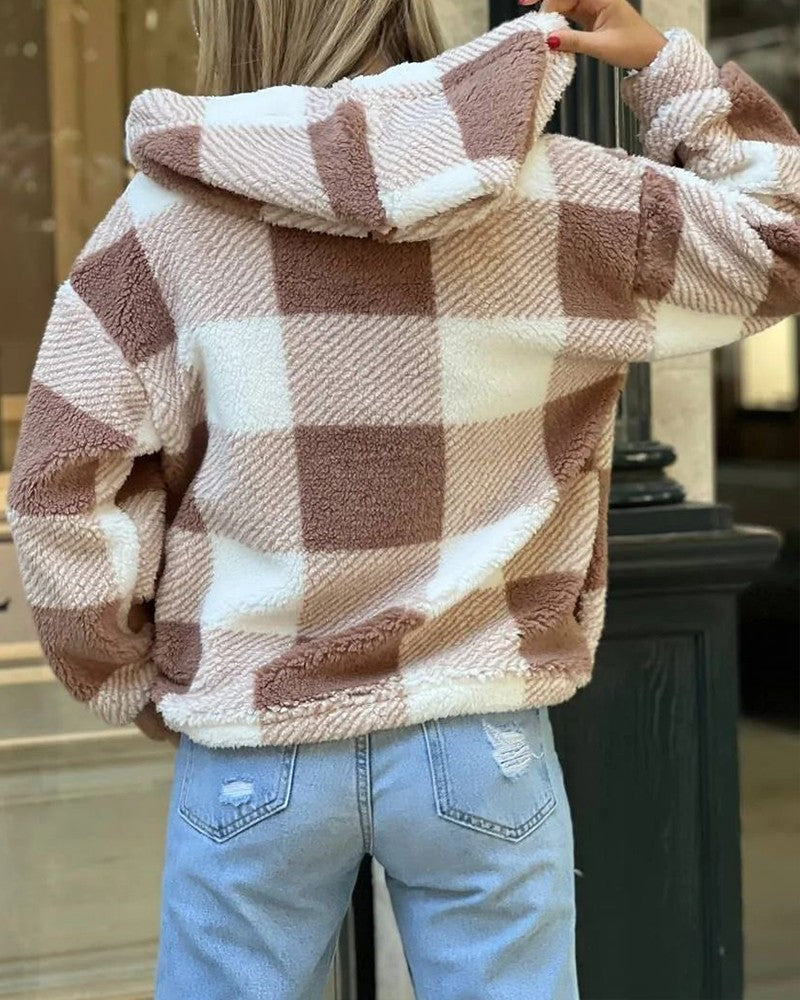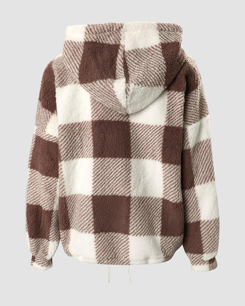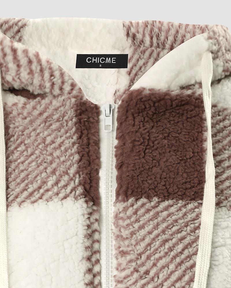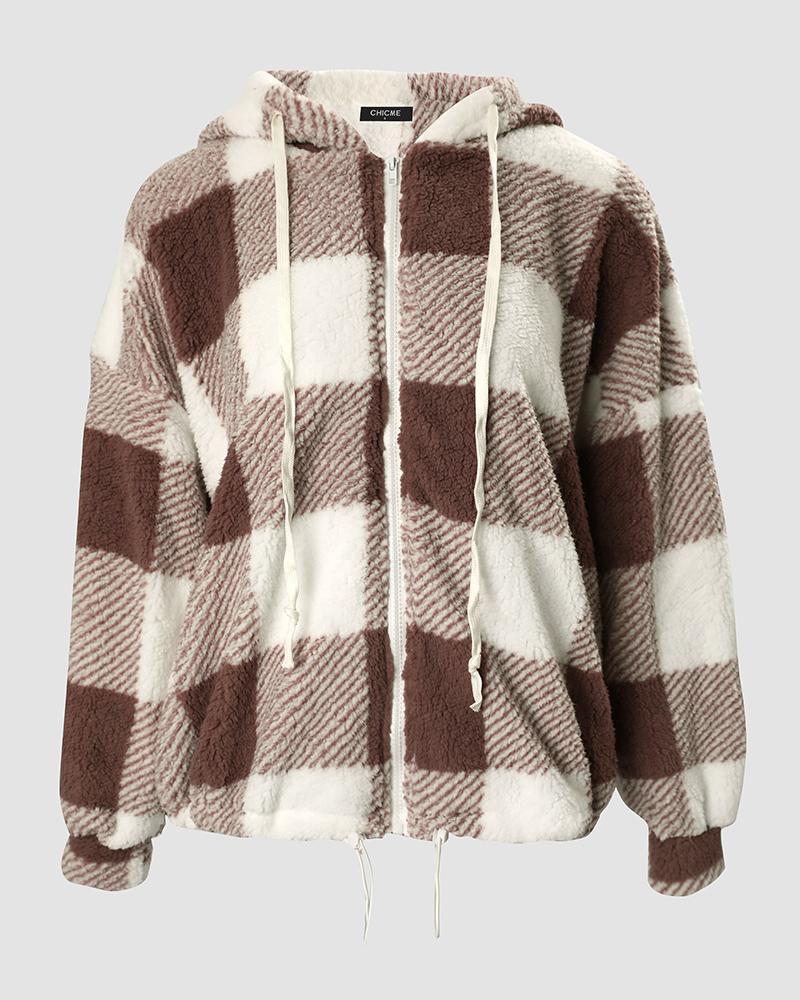 Plaid Print Long Sleeve Hooded Zip Up Teddy Coat