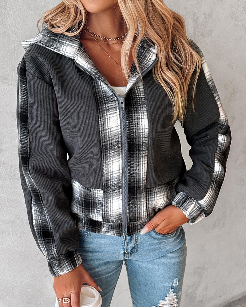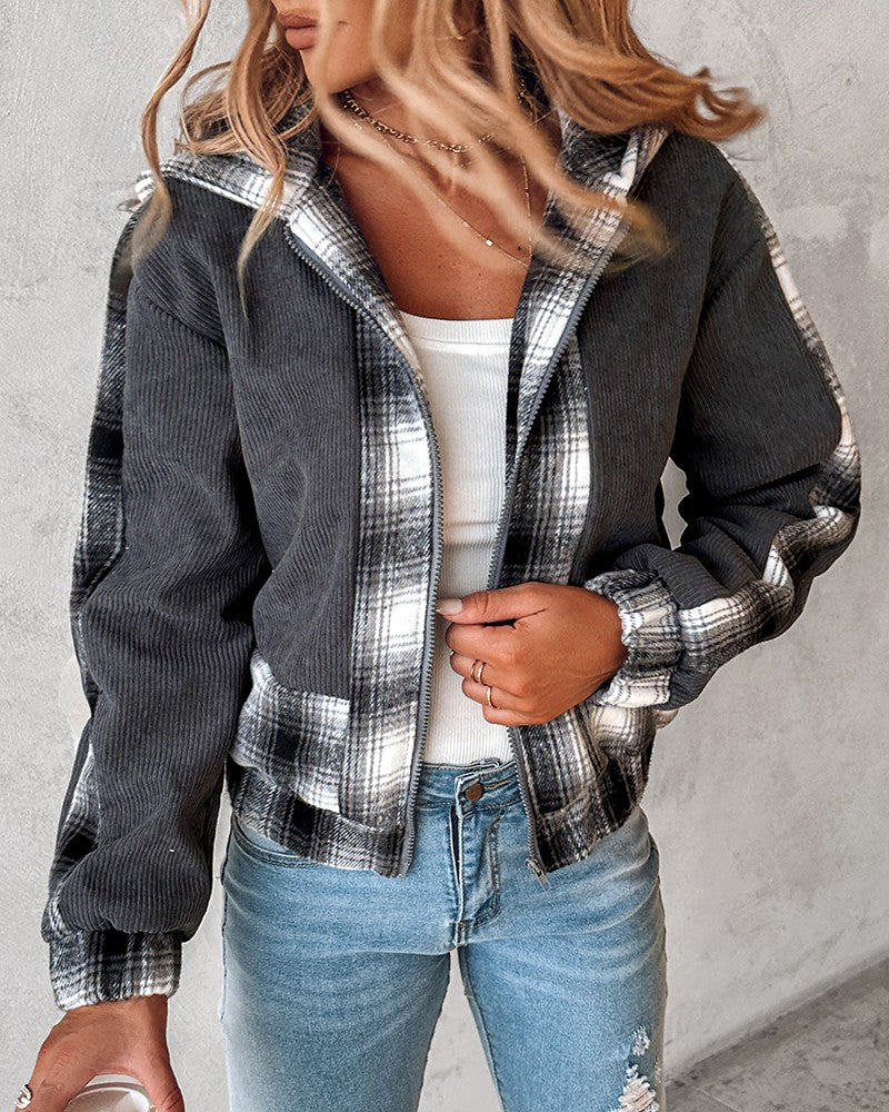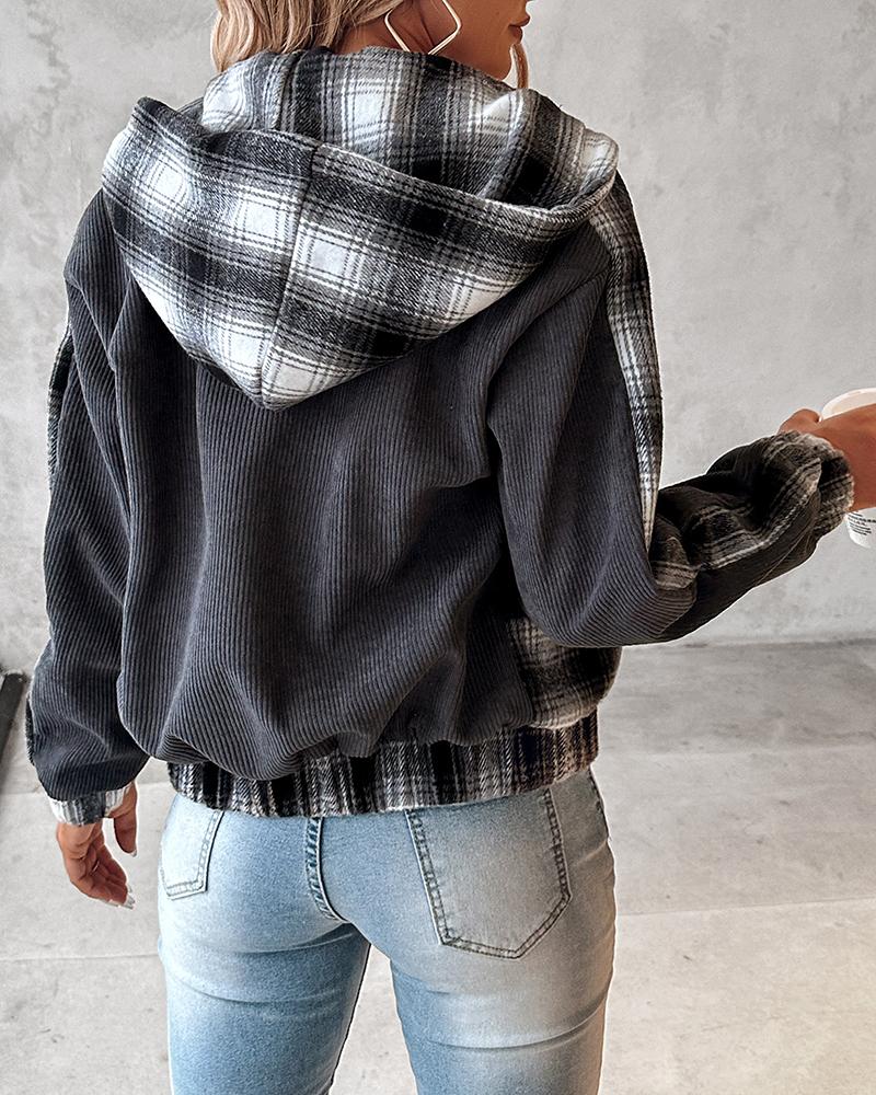 Plaid Print Patchwork Hooded Corduroy Jacket