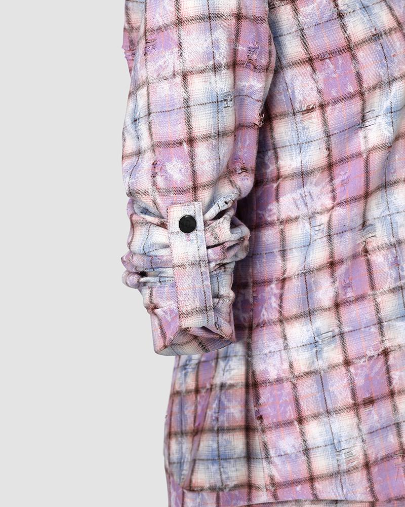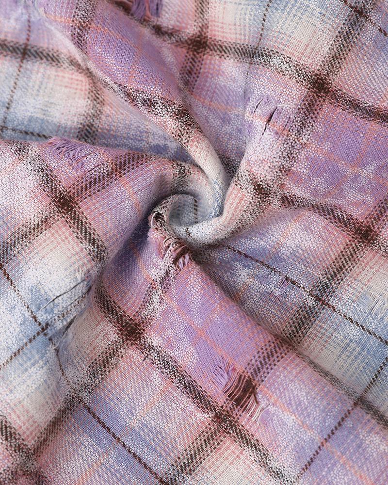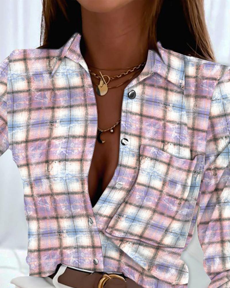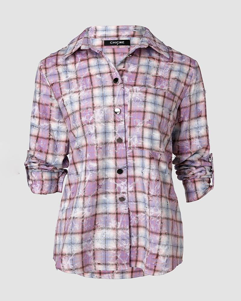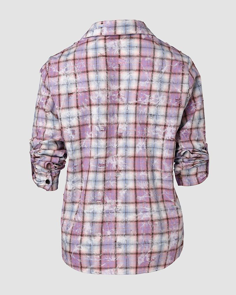 Plaid Print Roll Tab Sleeve Button Down Distressed Top