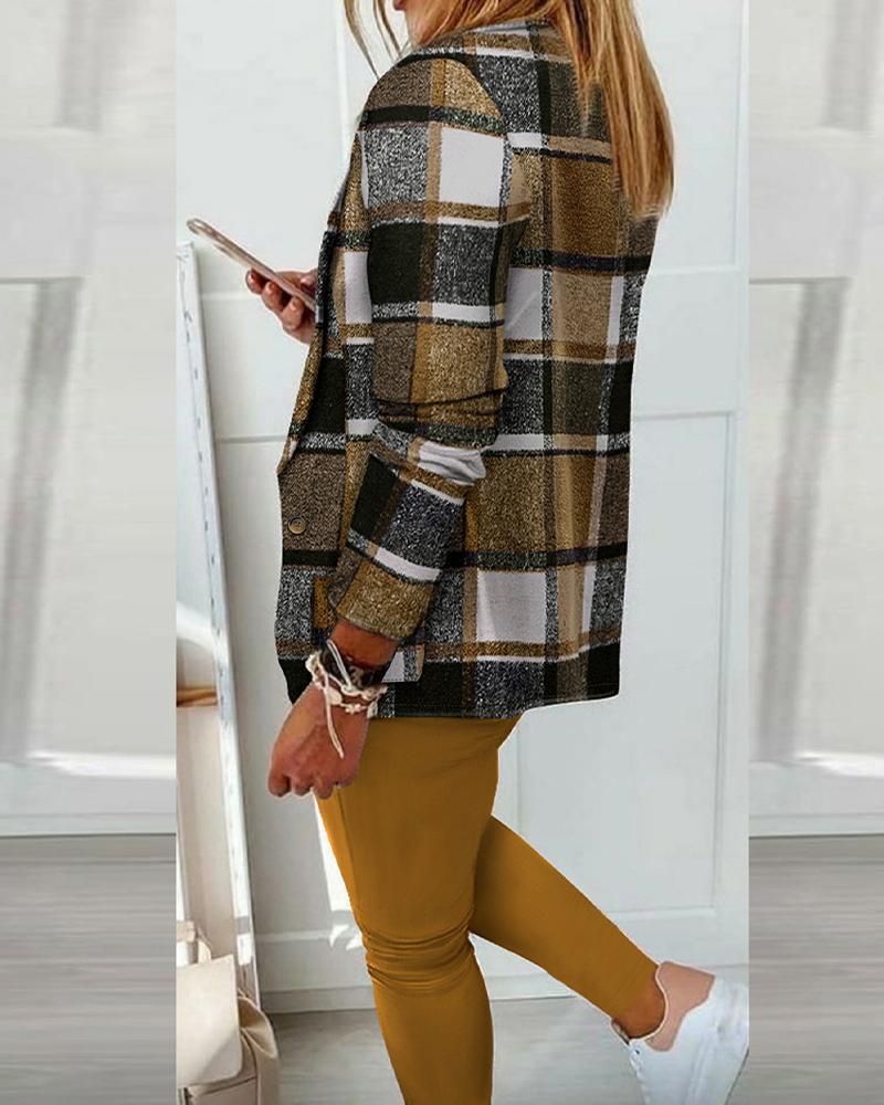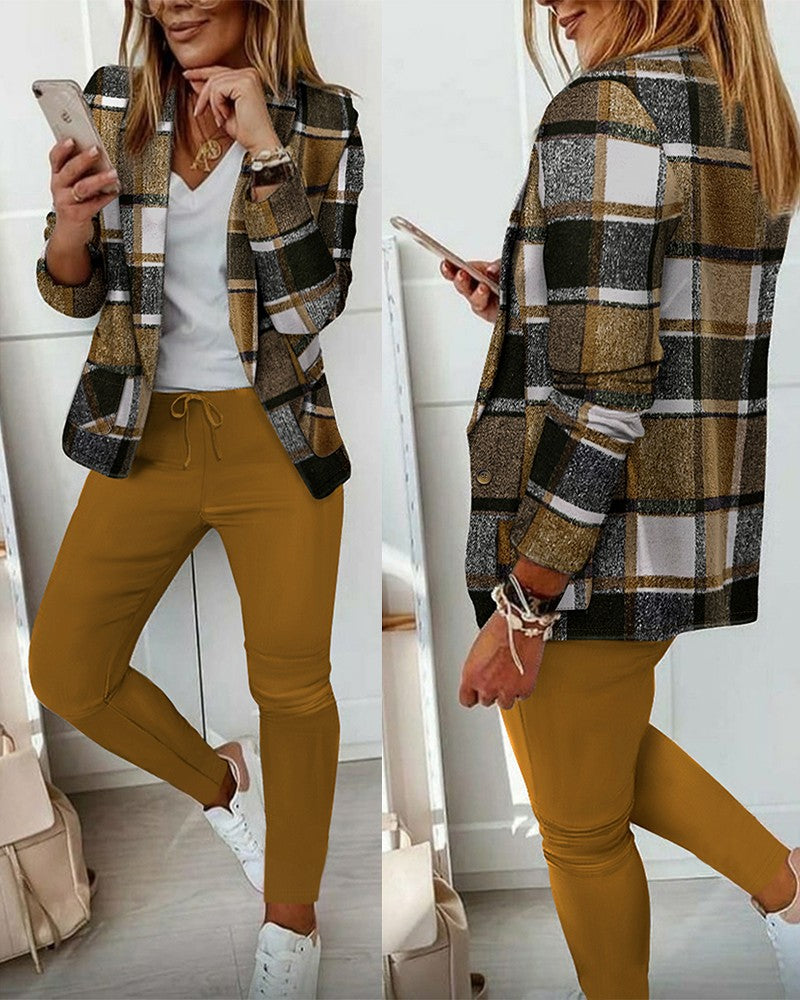 Plaid Print Shawl Collar Blazer Coat & Drawstring Pants Set