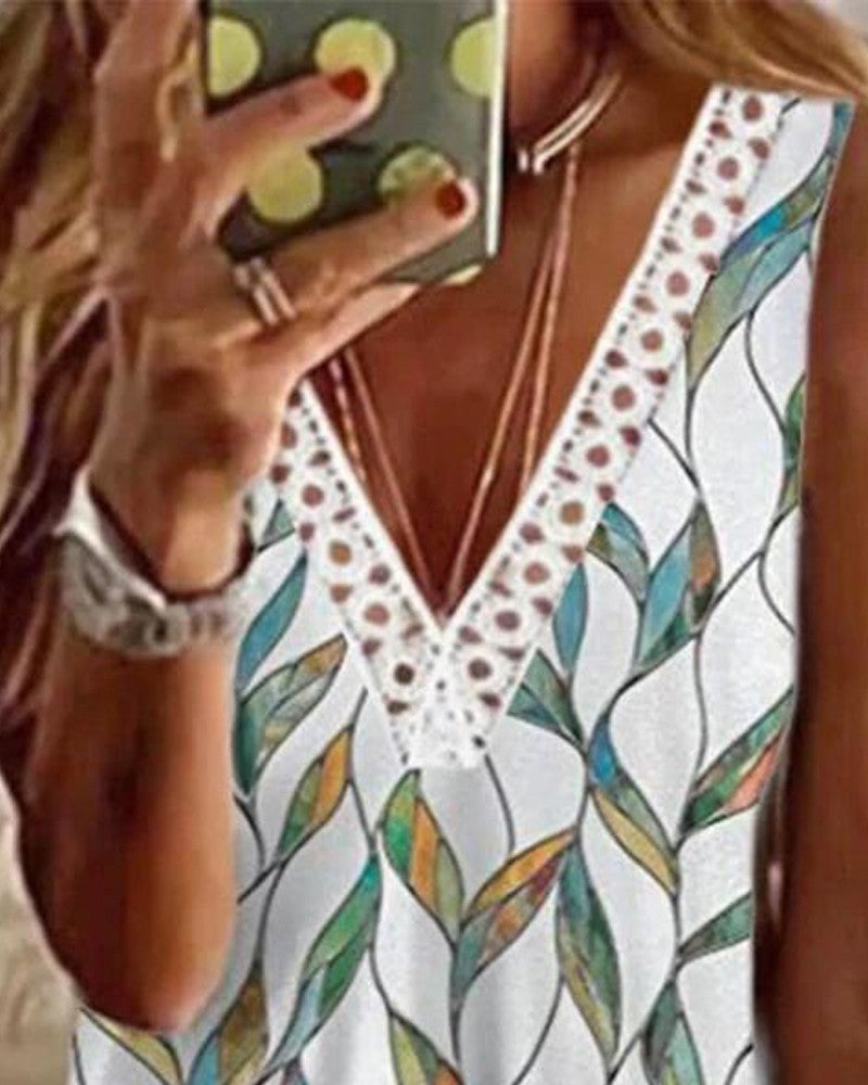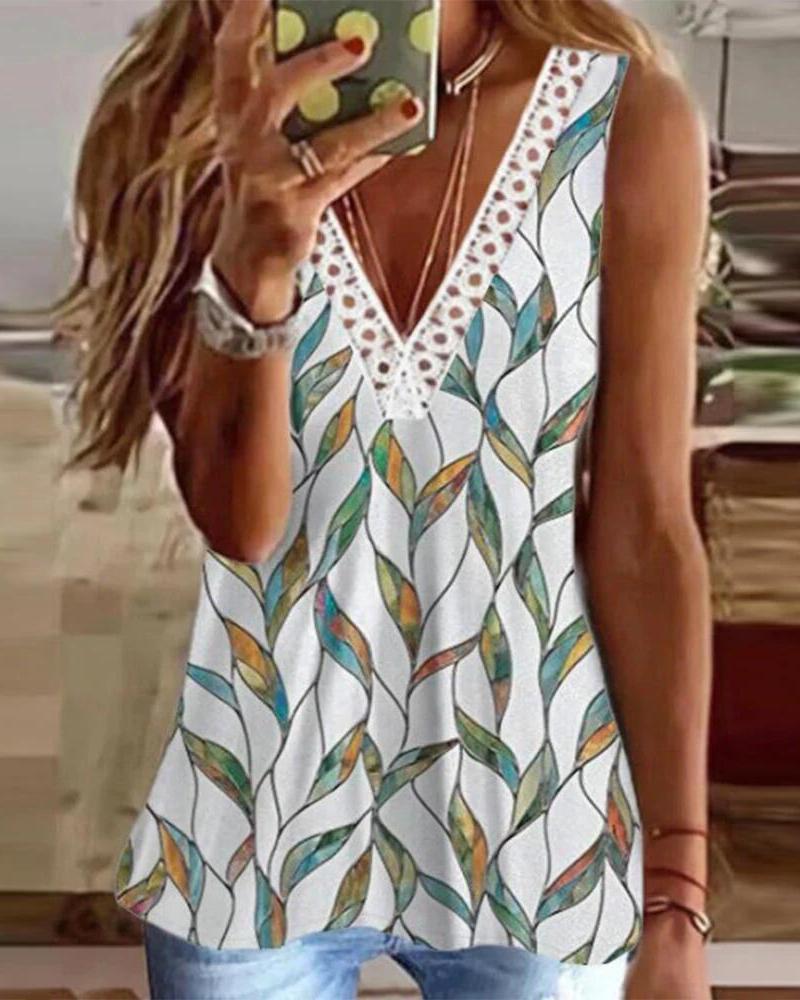 Plants Print Contrast Lace V Neck Tank Top