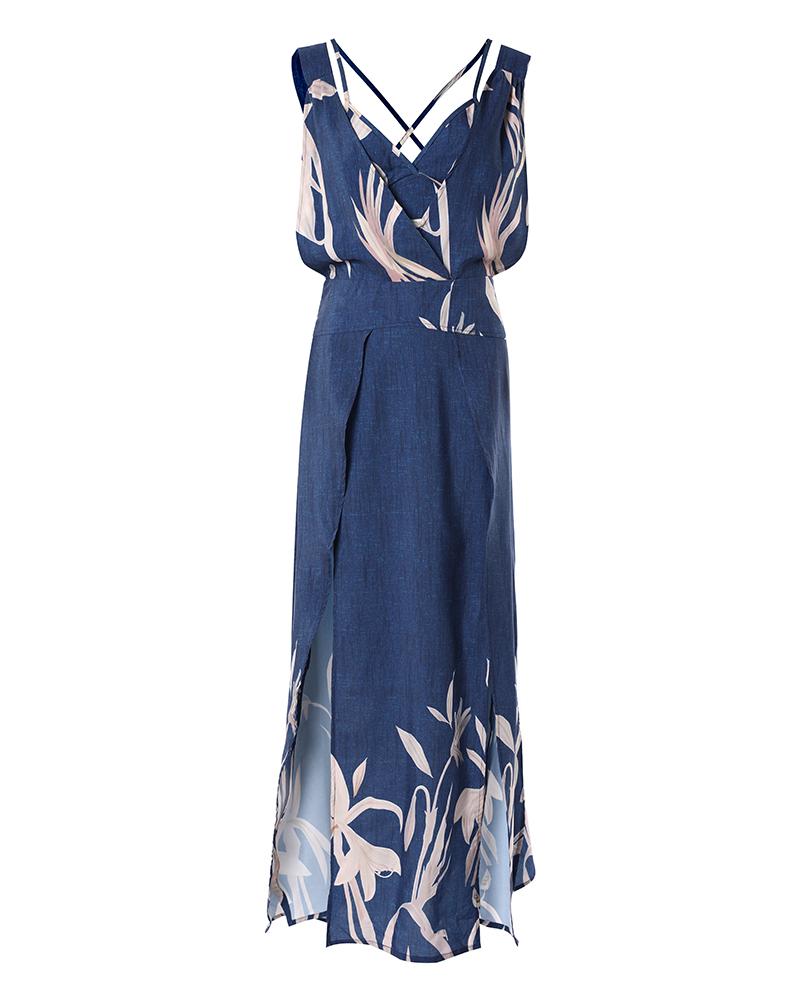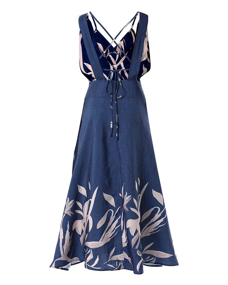 Plants Print Sleeveless High Slit Maxi Dress With Bra Top