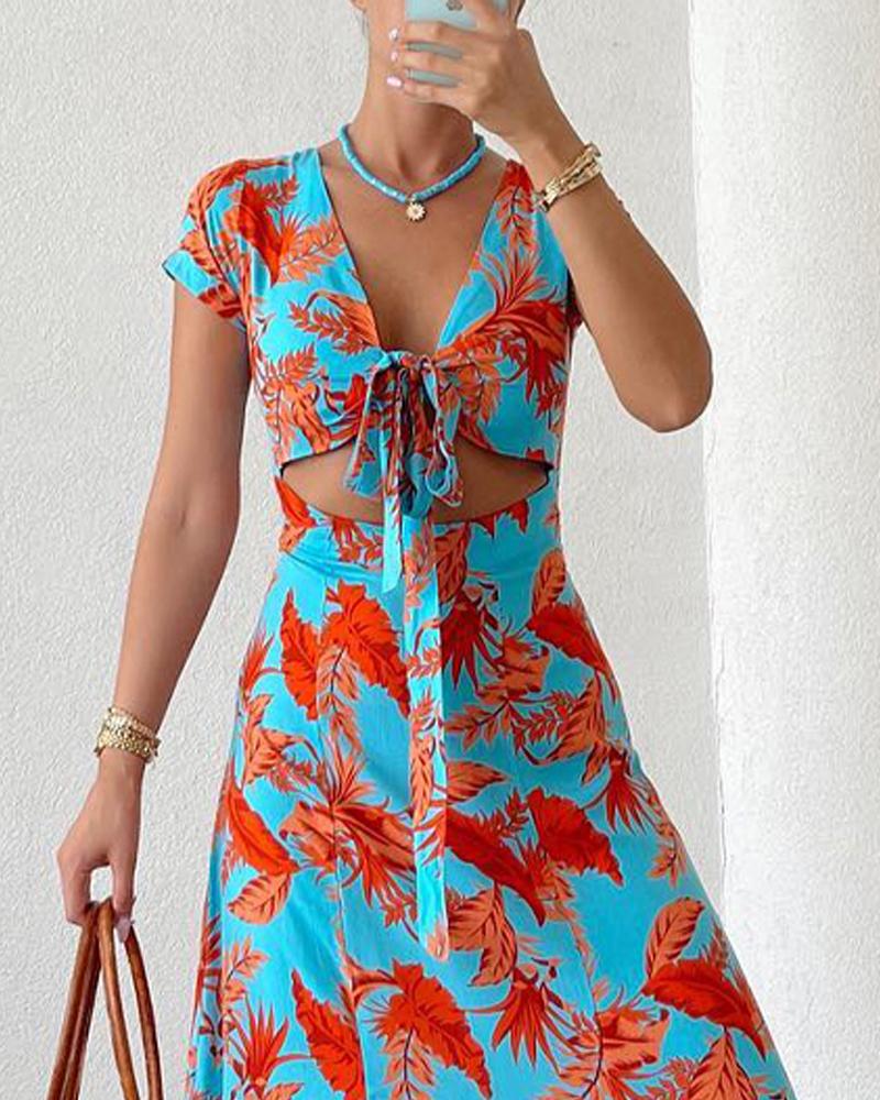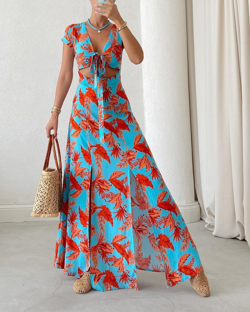 Plants Print Tie Front Crop Top & Slit Skirt Set