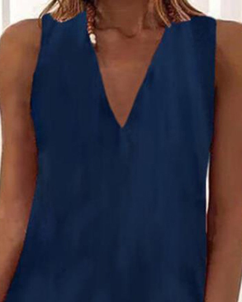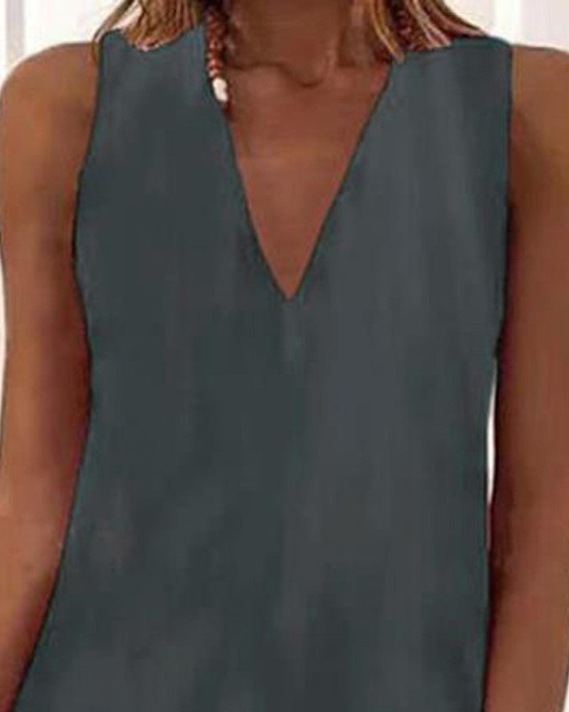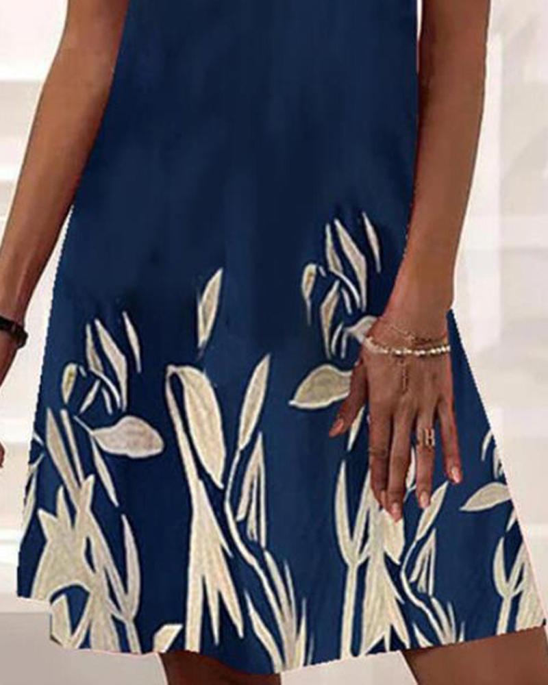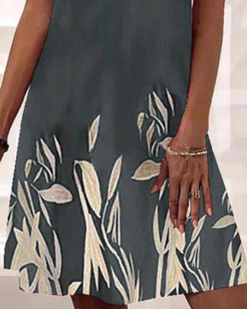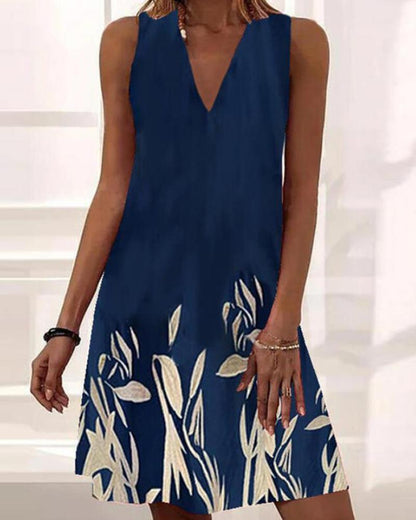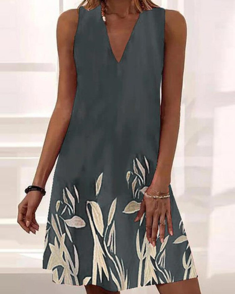 Plants Print V Neck Sleeveless Casual Swing Dress