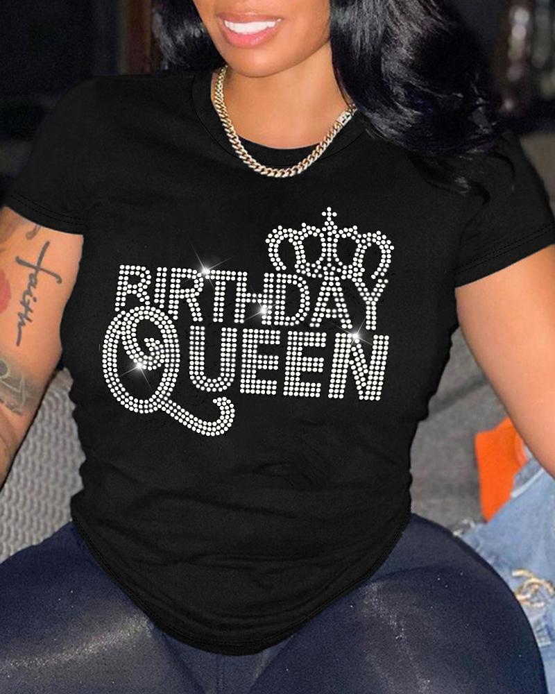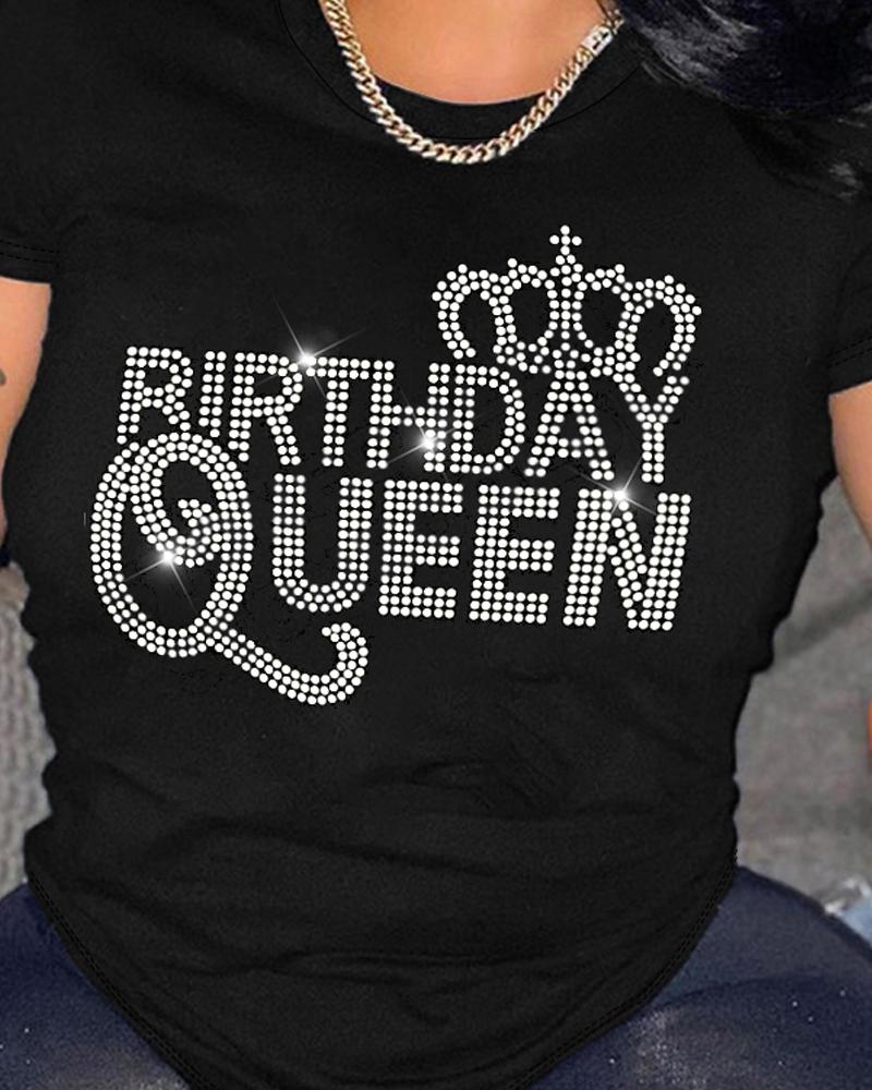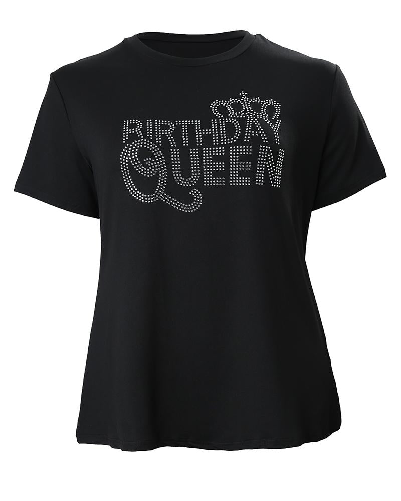 Plus Size Birthday Queen Rhinestone Casual T shirt