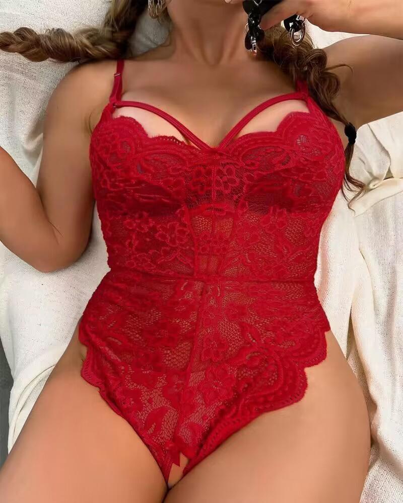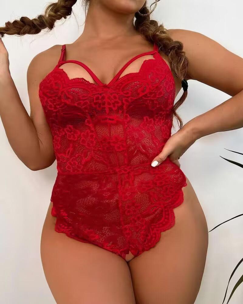 Plus Size Crochet Lace up Crotchless Scallop Trim Teddy