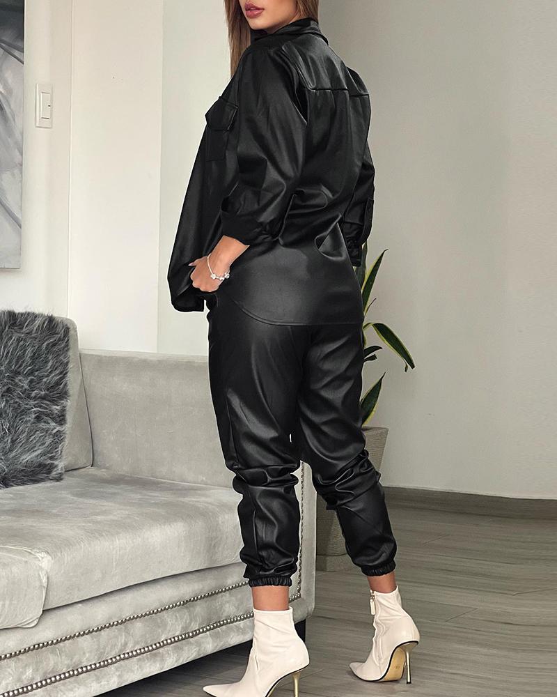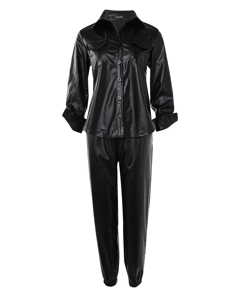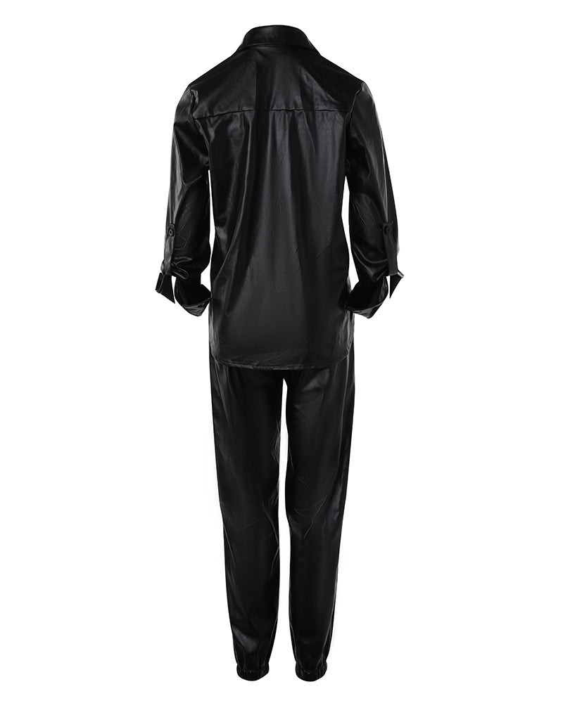 Pocket Design PU Leather Shirt & Cuffed Pants Set