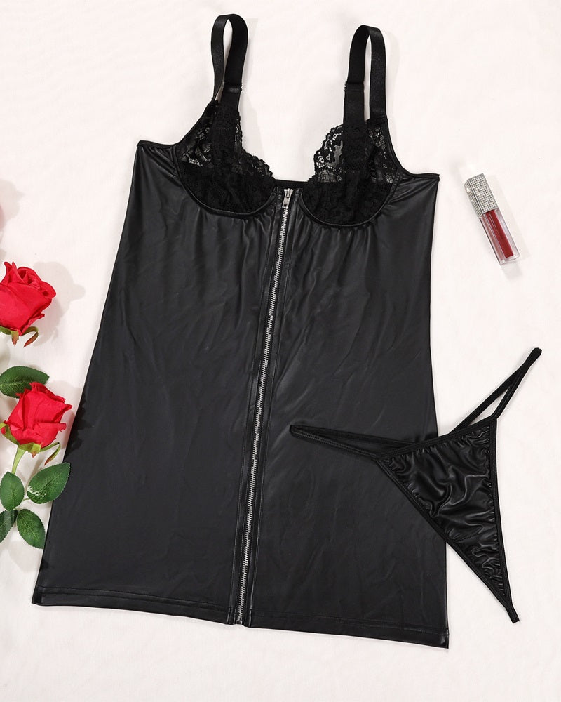 PU Leather Crochet Lace Zipper Design Babydoll With Panty