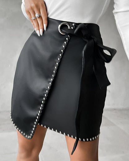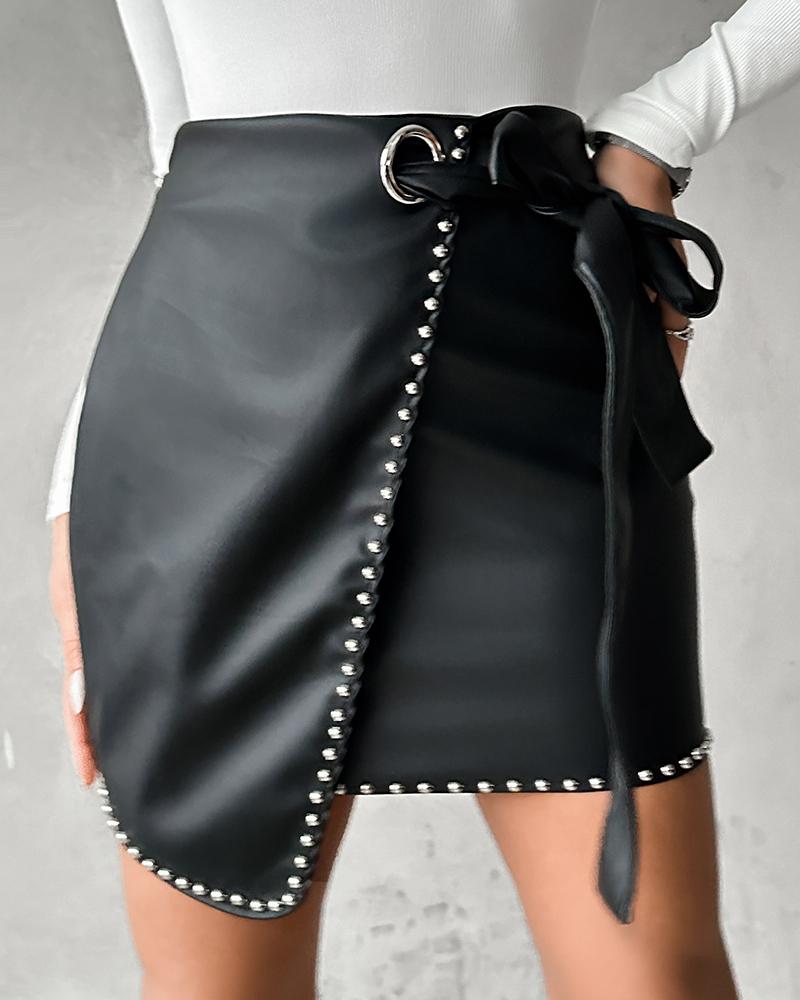 PU Leather Eyelet Tied Detail Studded Asymmetrical Skirt