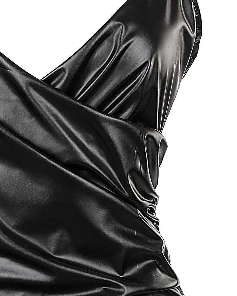 PU Leather Spaghetti Strap Ruched Bodycon Dress