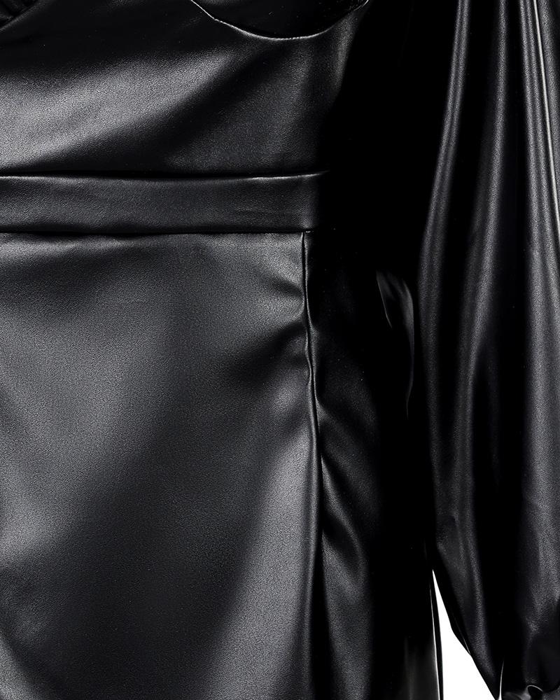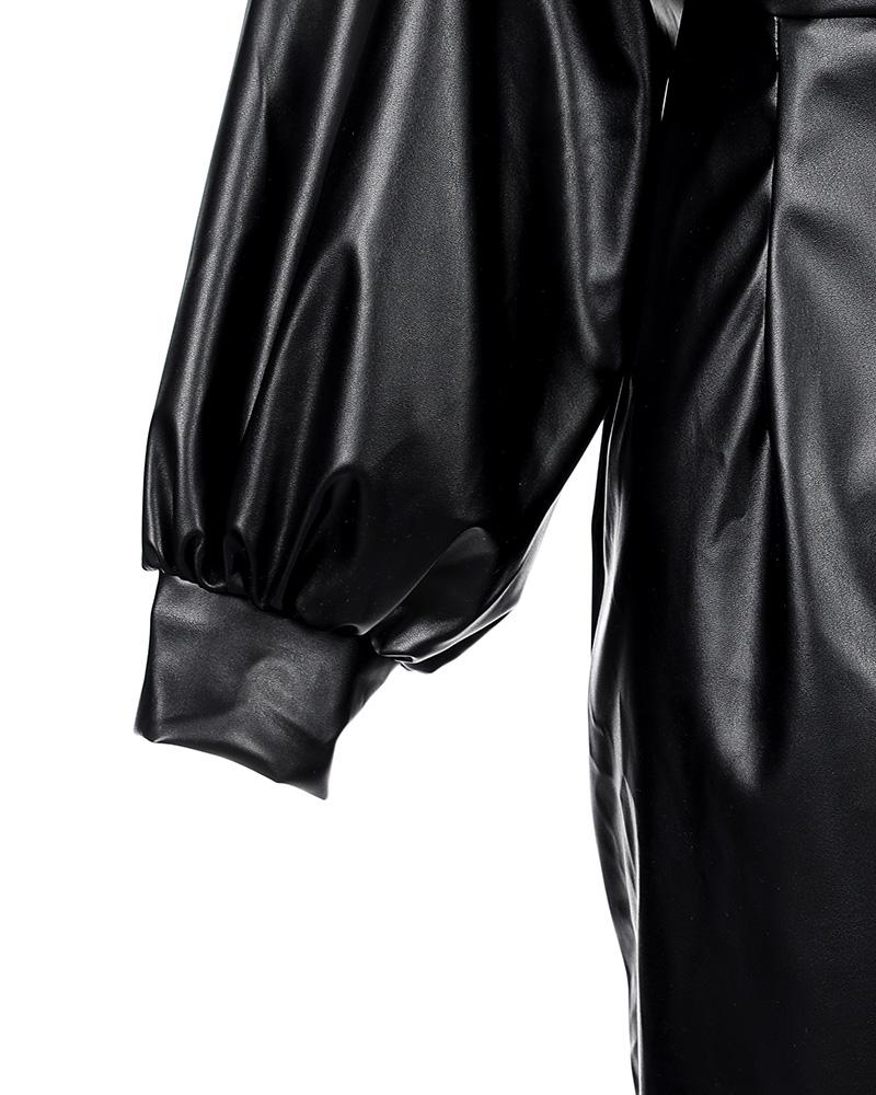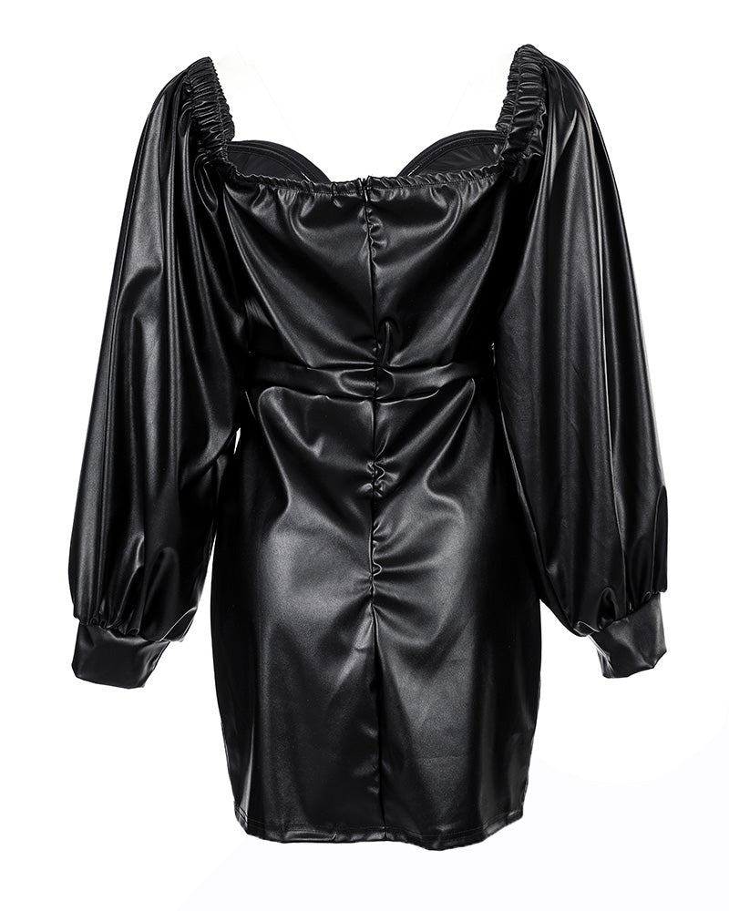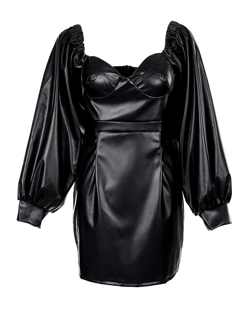 Puff Lantern Sleeve PU Leather Bodycon Dress