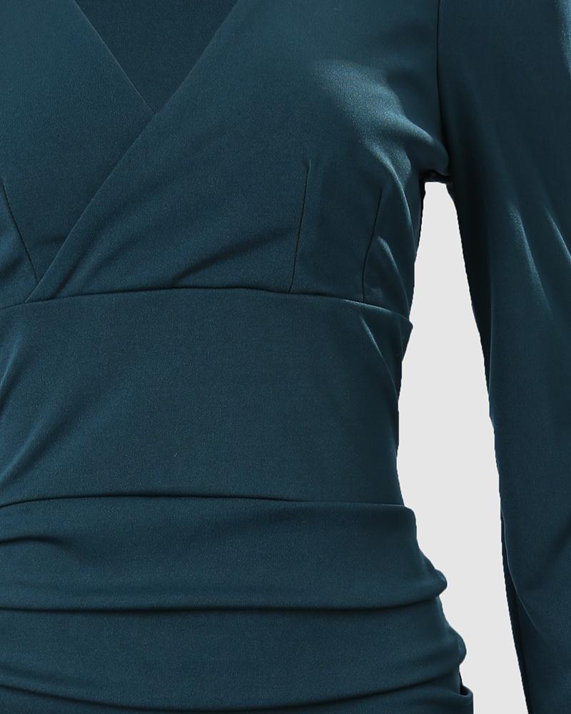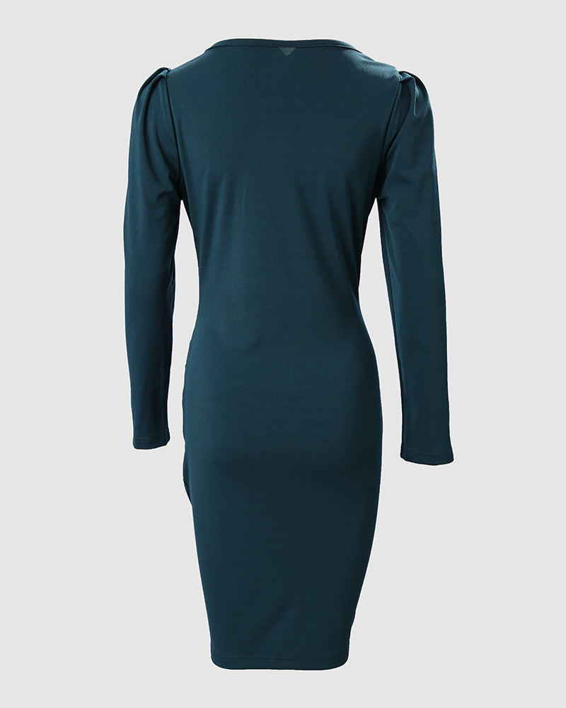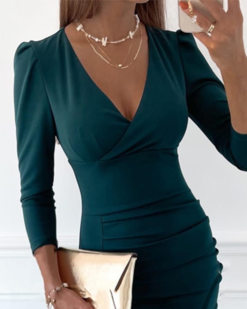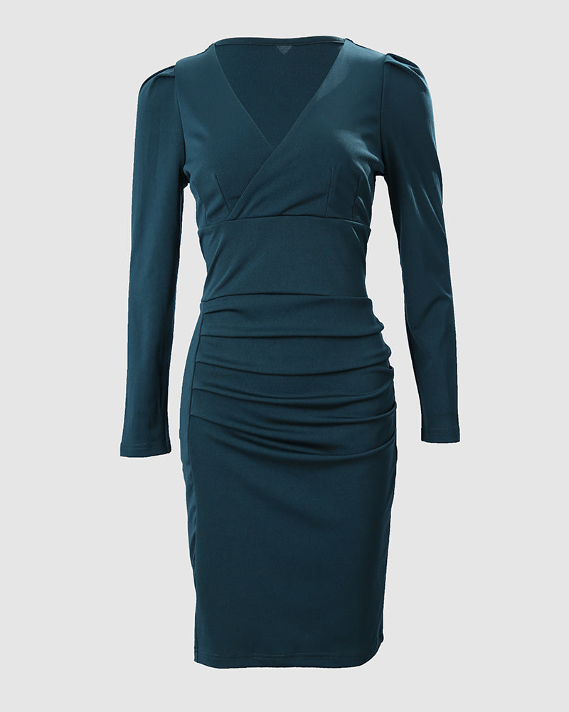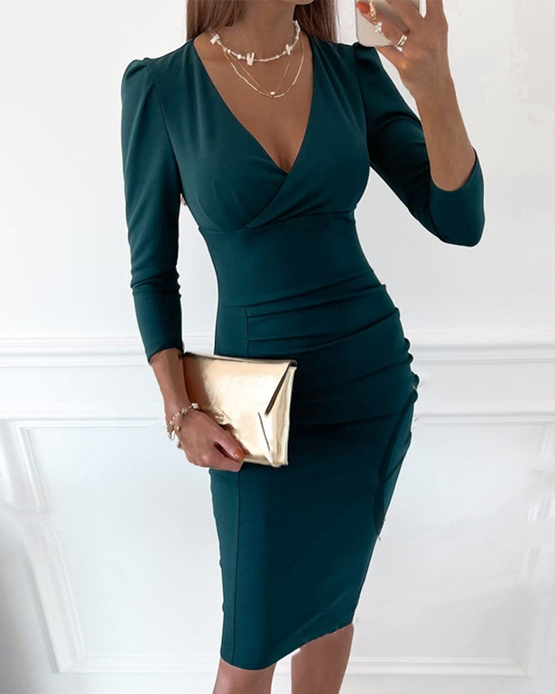 Puff Sleeve Surplice Neck Ruched Midi Dress