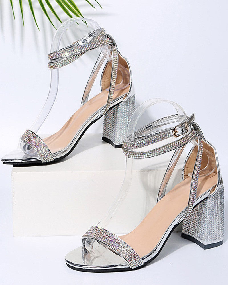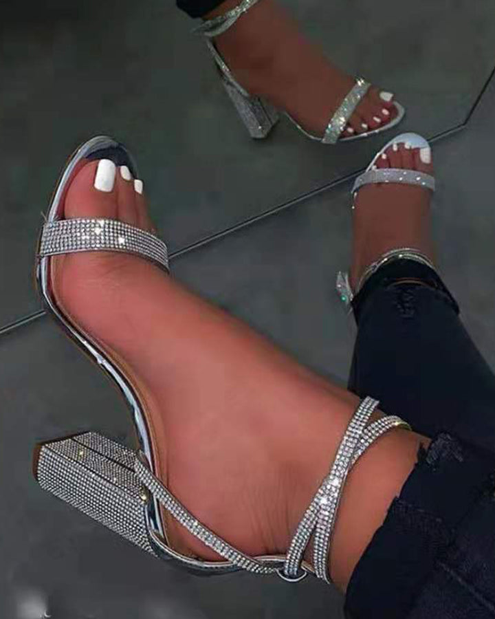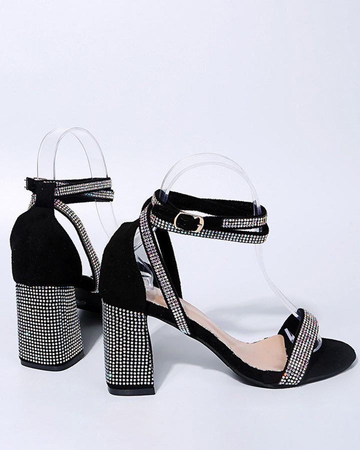Rhinestone Ankle Strap Chunky Heels