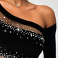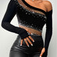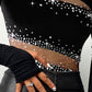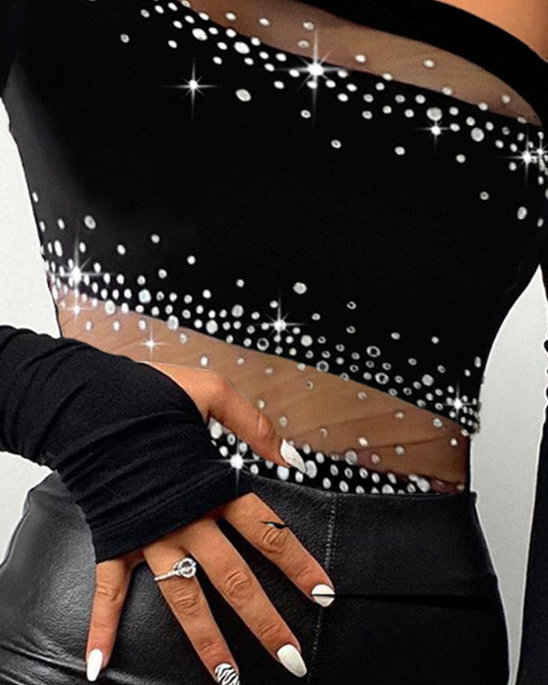 Rhinestone Bandeau Sheer Mesh Slim Fit Long Sleeve Tee Sexy Top