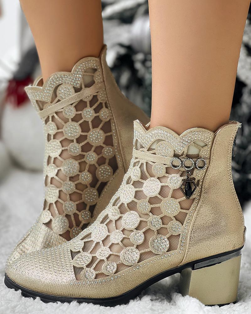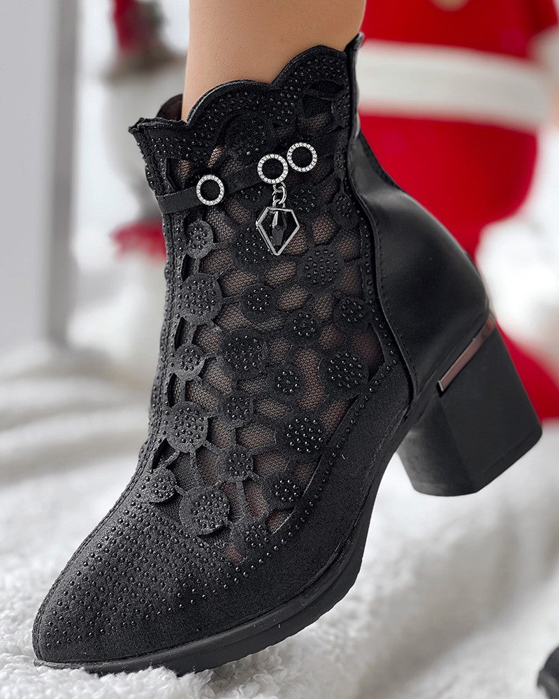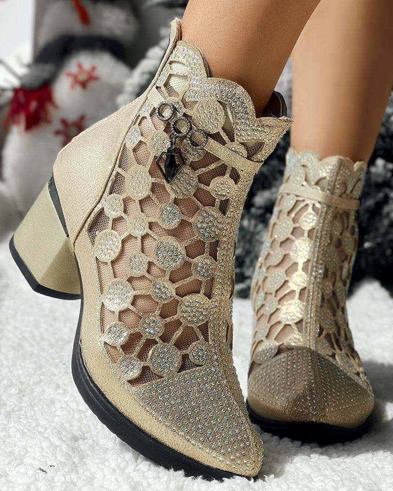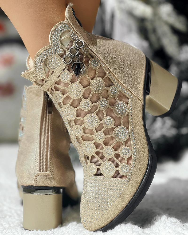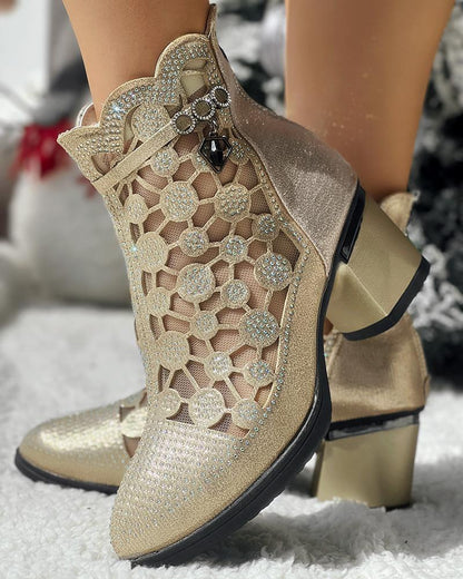 Rhinestone Breathable Chunky Heel Ankle Boots