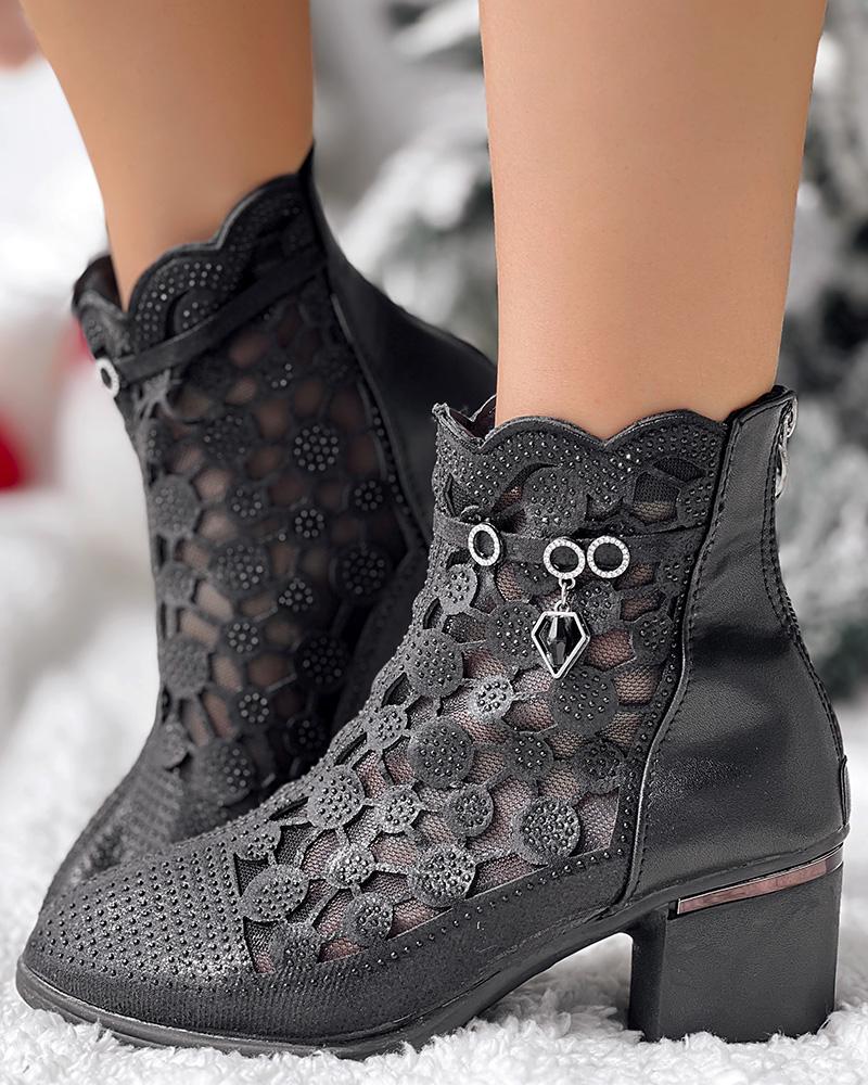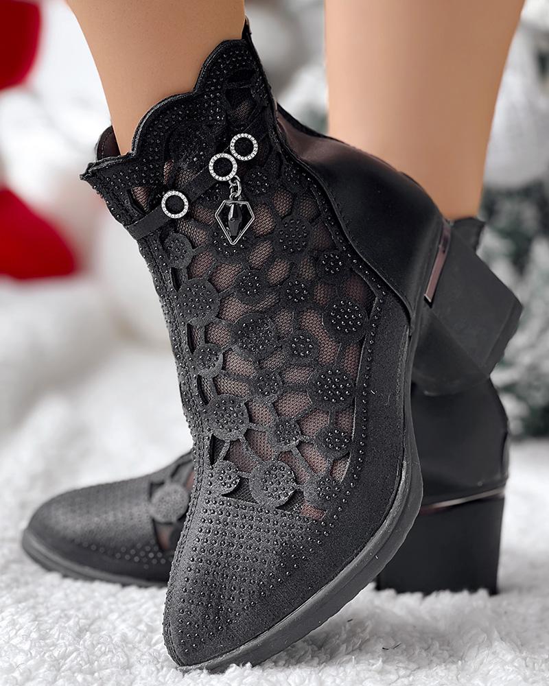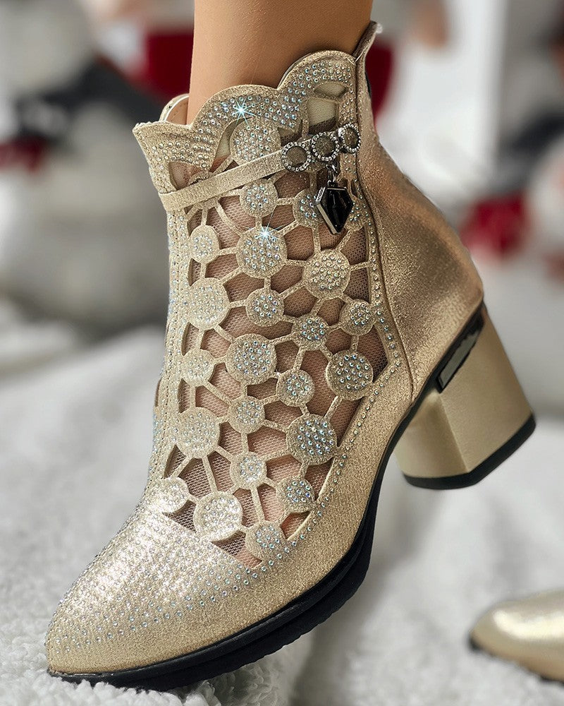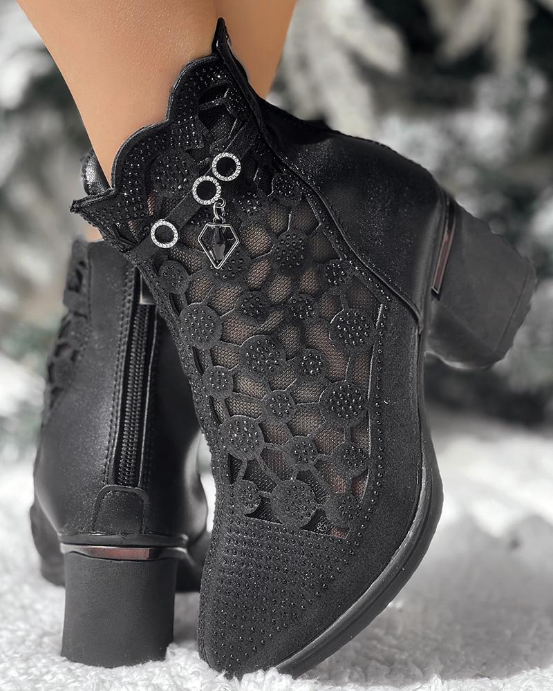 Rhinestone Breathable Chunky Heel Ankle Boots