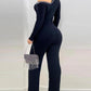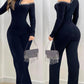 Rhinestone Cold Shoulder High Neck Jumpsuit Long Sleeve Slim Fit Flared Jumpsuit