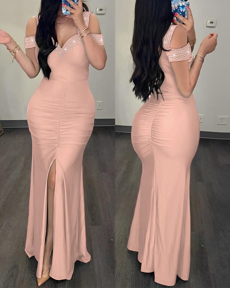 Rhinestone Cold Shoulder Slit Ruched Party Dress
