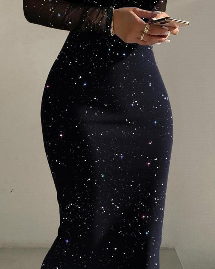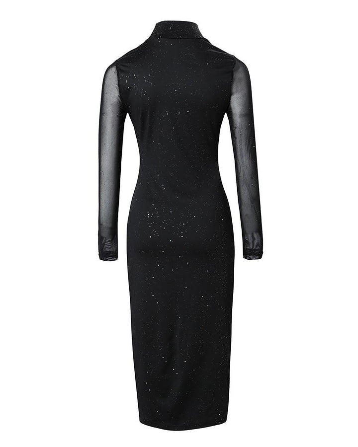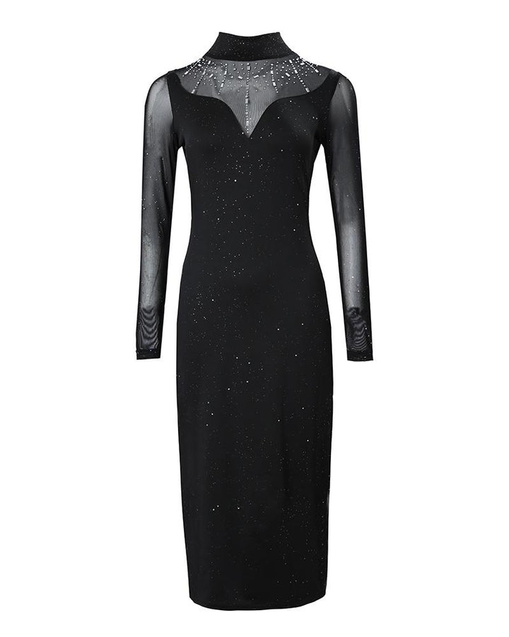 Rhinestone Contrast Mesh Long Sleeve Glitter Bodycon Dress