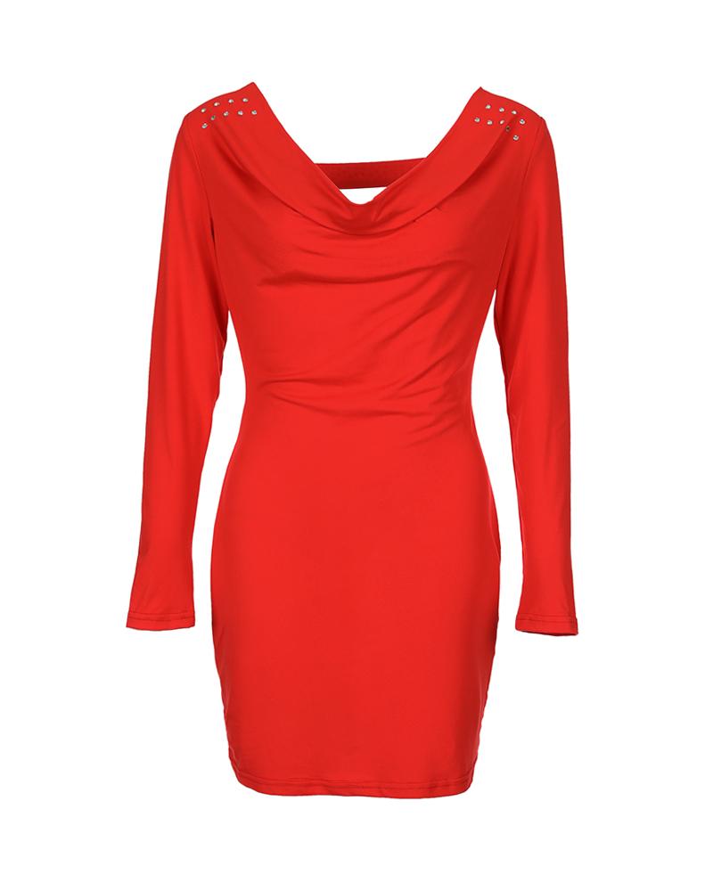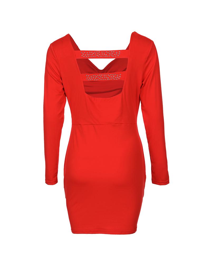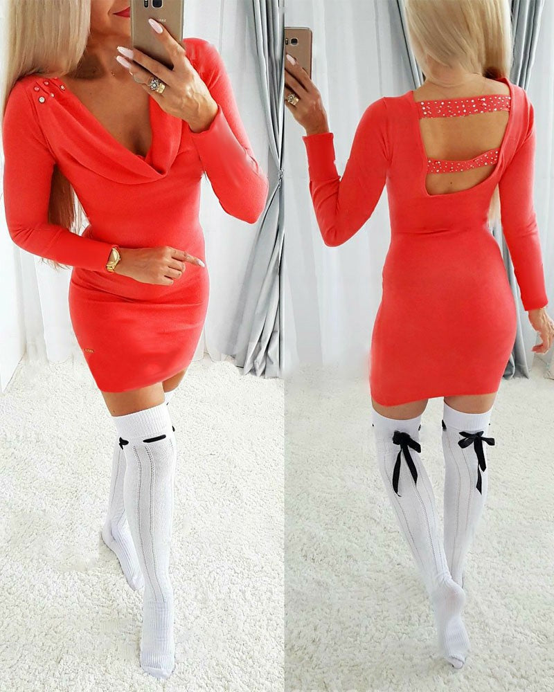 Rhinestone Decor Backless Long Sleeve Bodycon Dress