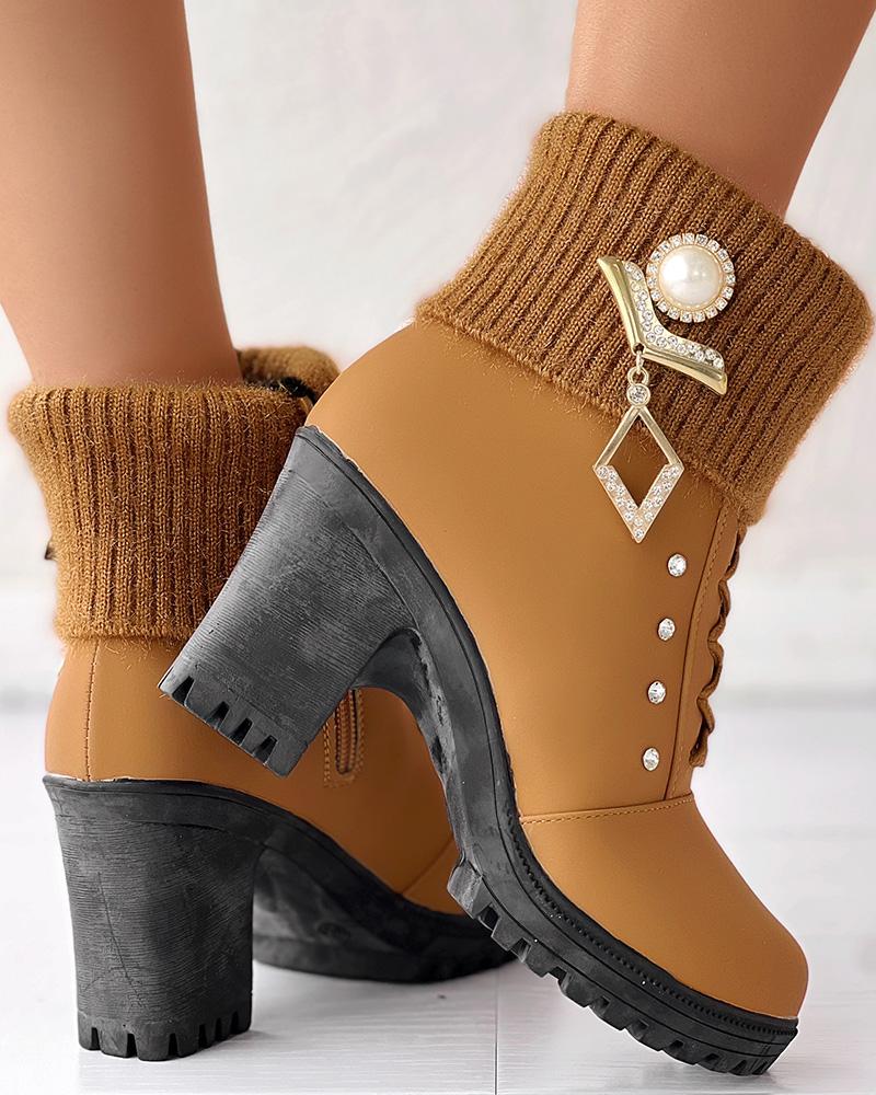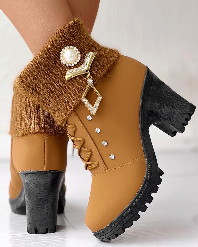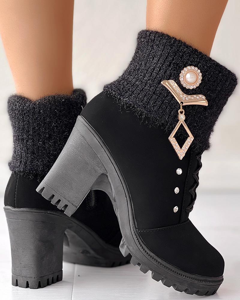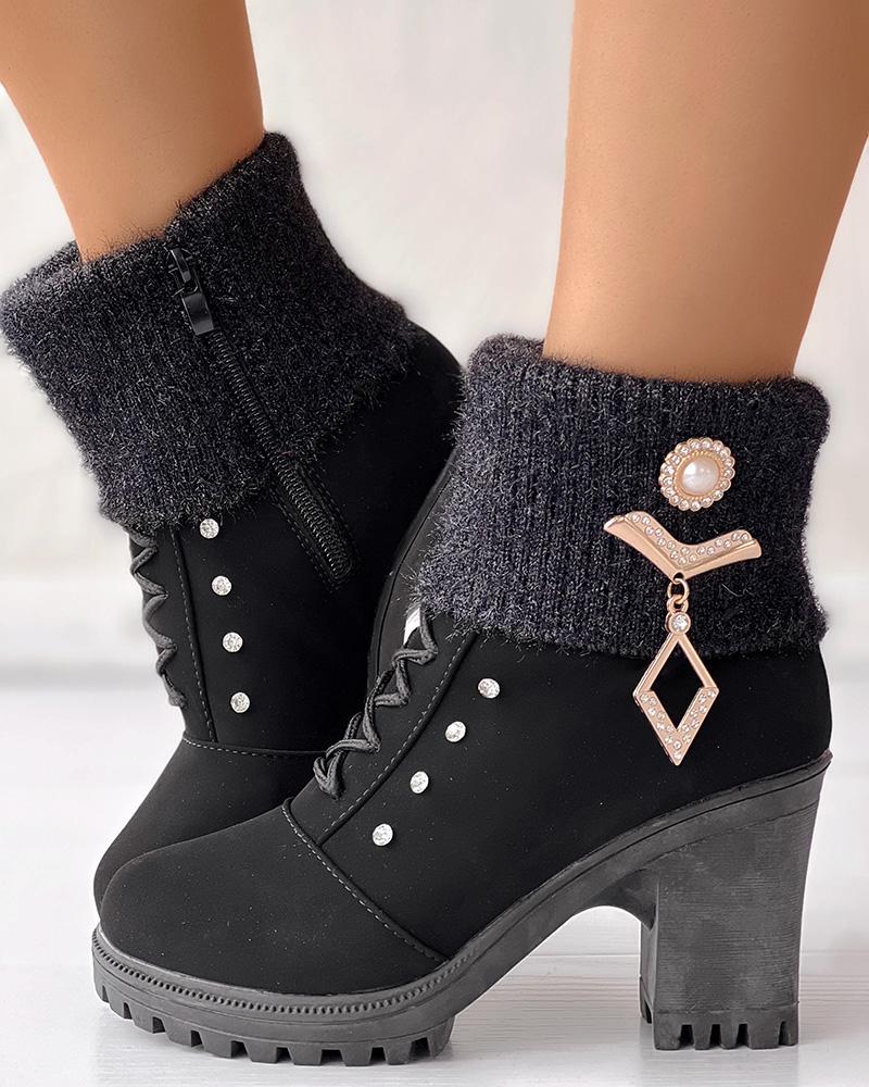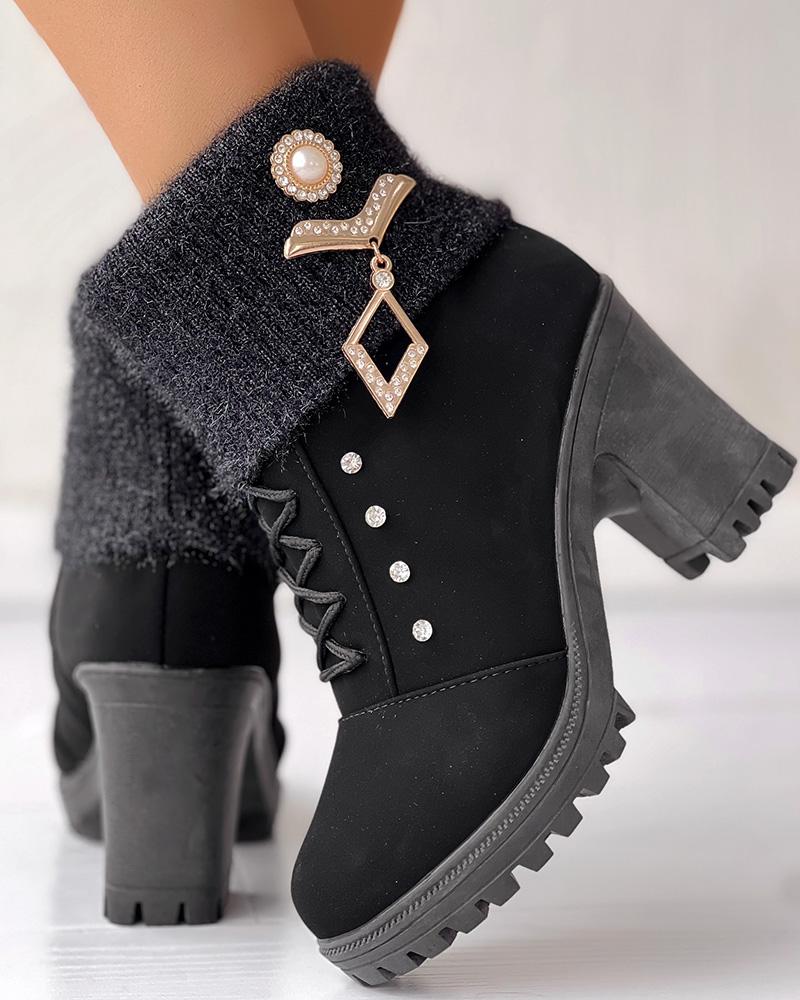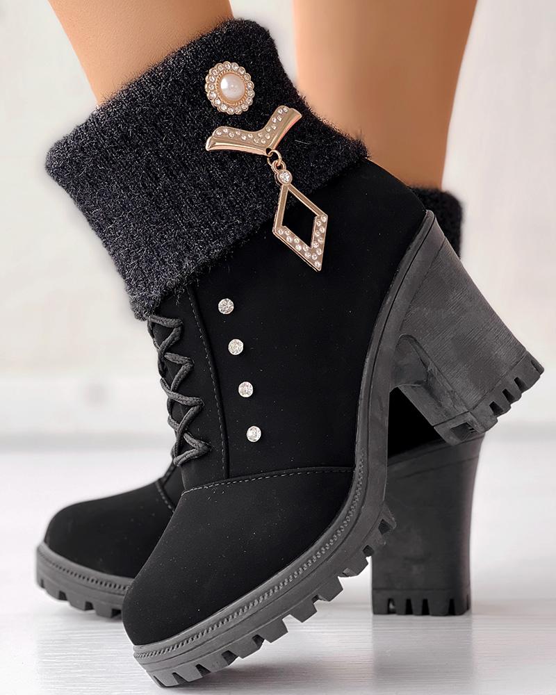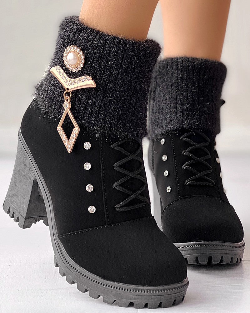 Rhinestone Decor Lace up Chunky Heel Lined Ankle Boots