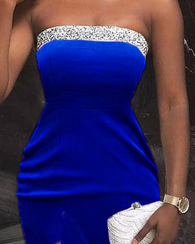 Rhinestone Decor Slit Ruffles Velvet Evening Dress