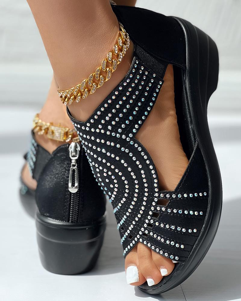 Rhinestone Geometric Pattern Peep Toe Wedge Heels