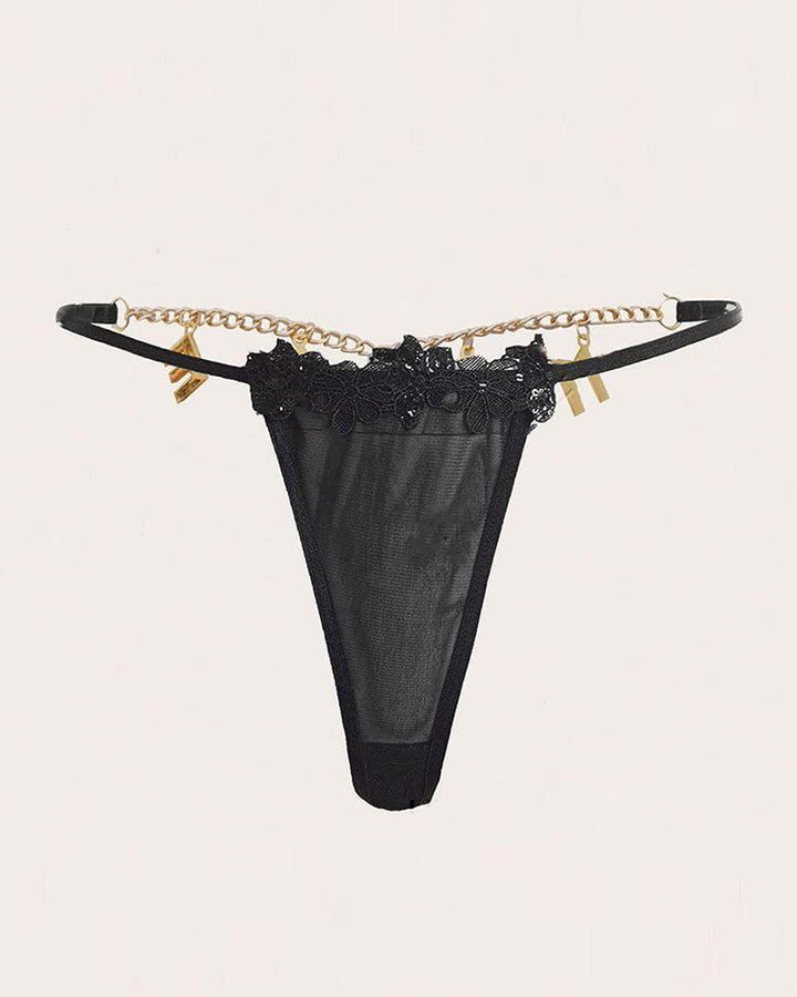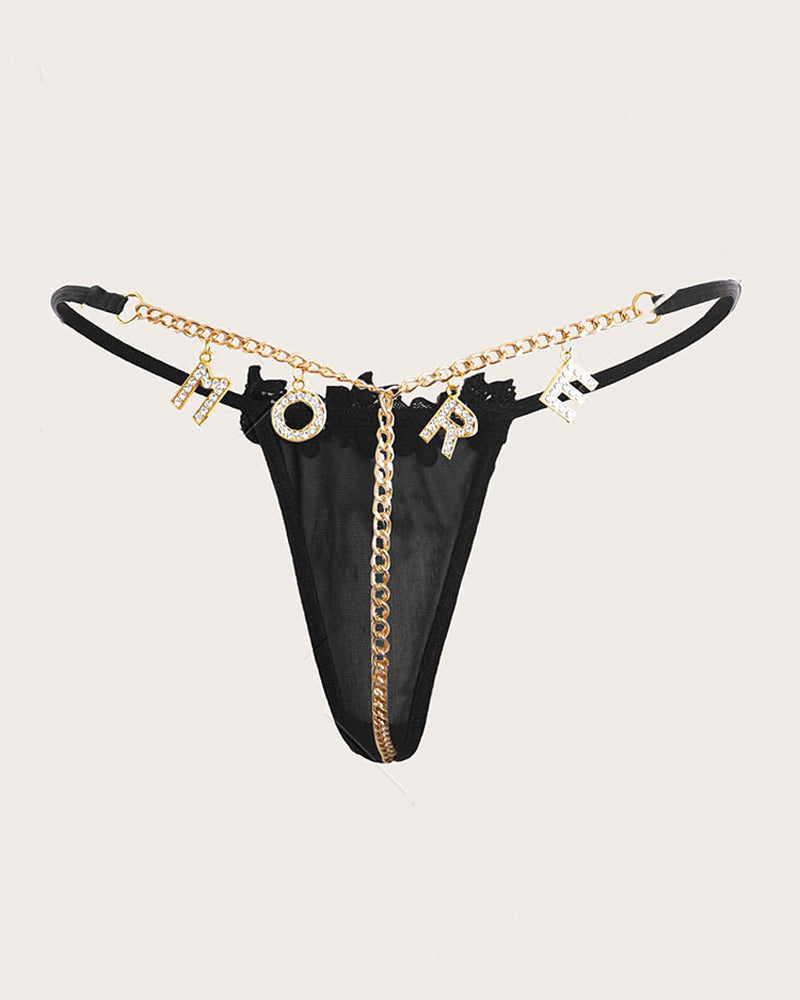 Rhinestone Letter Chain Decor Lace Thong Panty