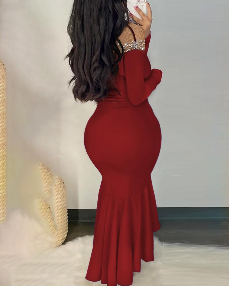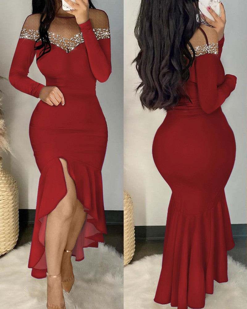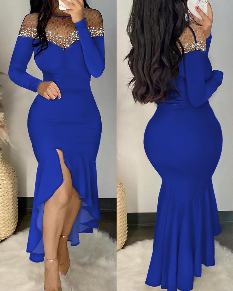 Rhinestone Mesh Patch Ruffles Asymmetrical Hem Party Dress