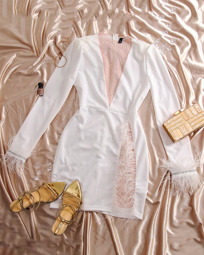 Rhinestone Patch Sheer Mesh Feather Trim Party Dress