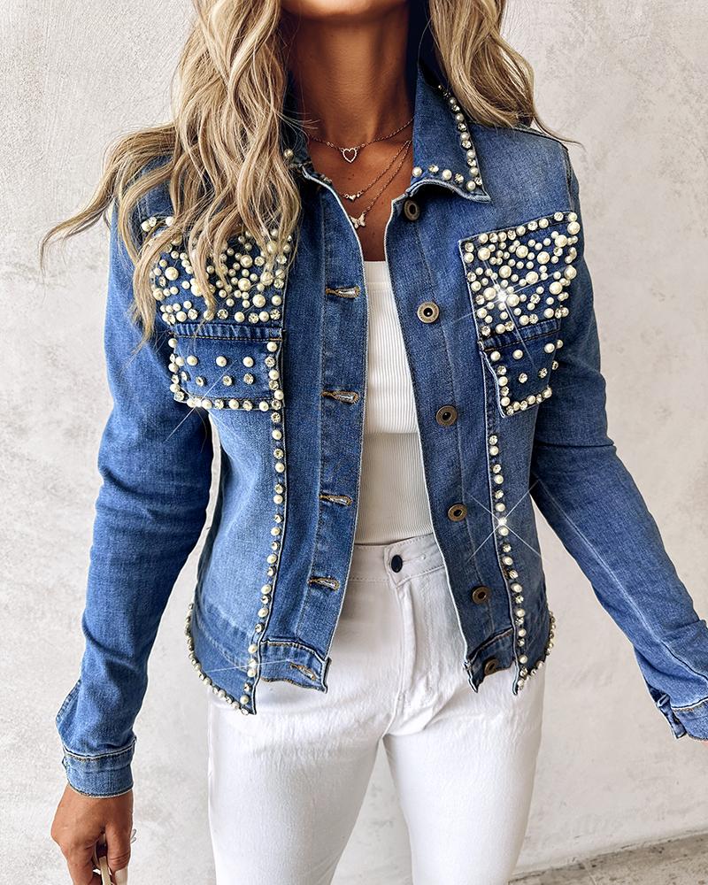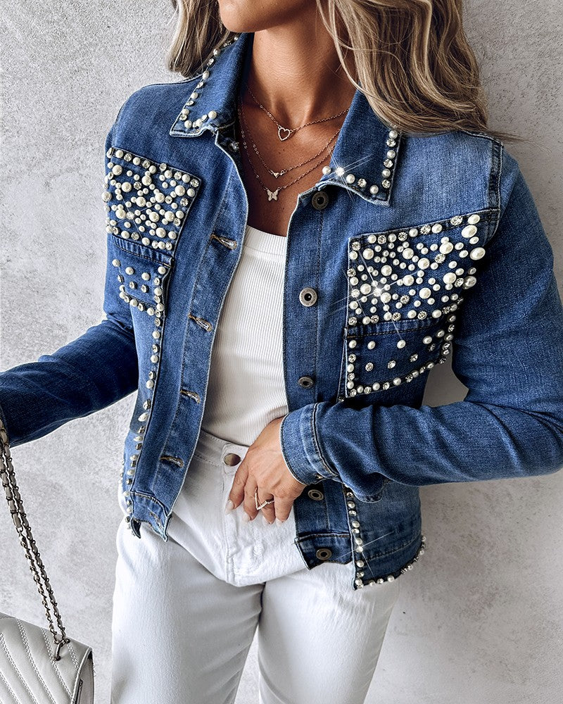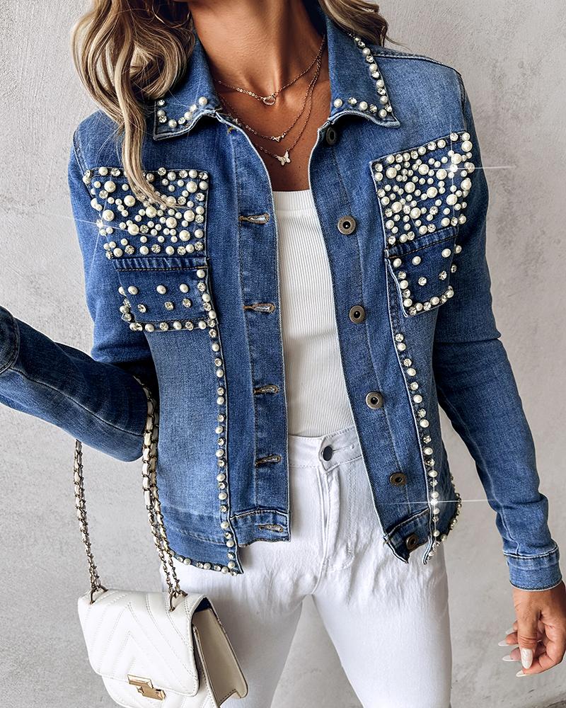 This denim jacket is sure to turn heads! With its intricately detailed rhinestone and pearl designs, you'll love the look and feel. Its unique style and quality construction make it the perfect addition to your wardrobe.