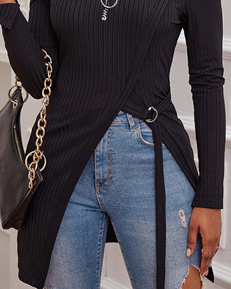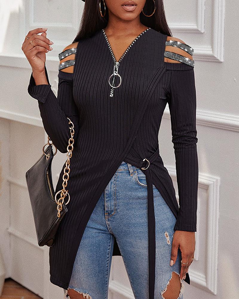 Rhinestone Strap Cold Shoulder Zip Front High Slit Top