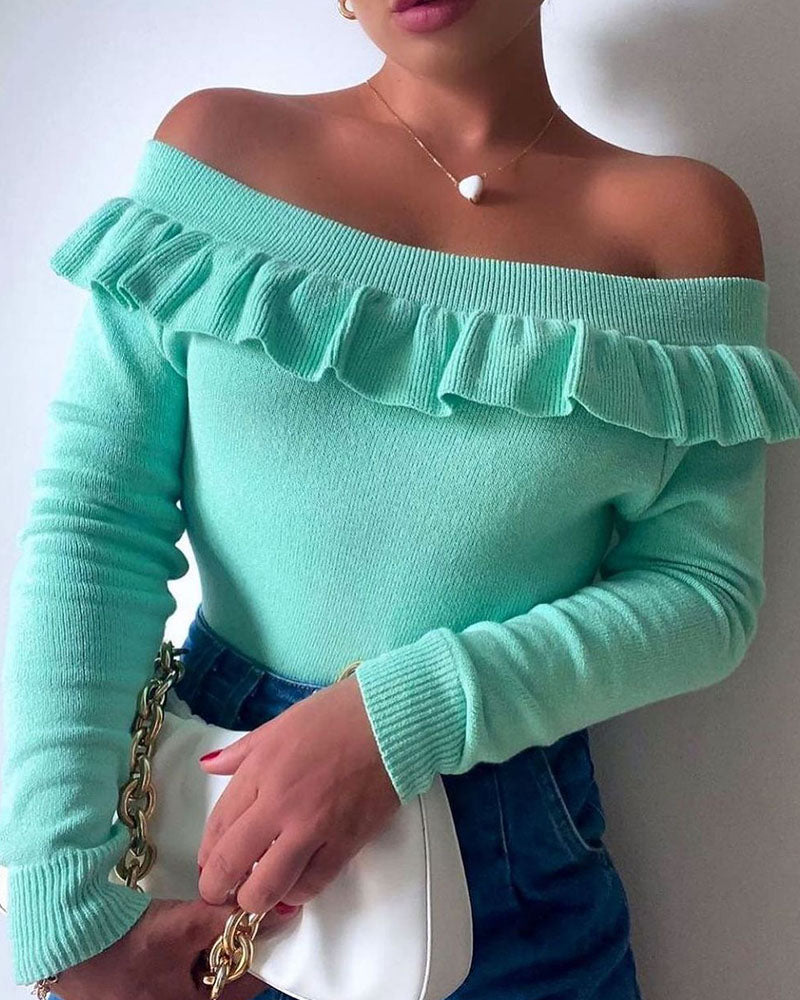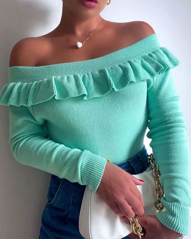 Ribbed Frill Hem Off Shoulder Sweater