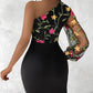 Rose Embroidery Pattern One Shoulder Bodycon Dress Sheer Mesh Sleeve Slim Fit Mini Dress