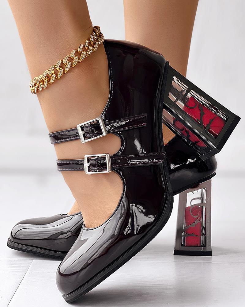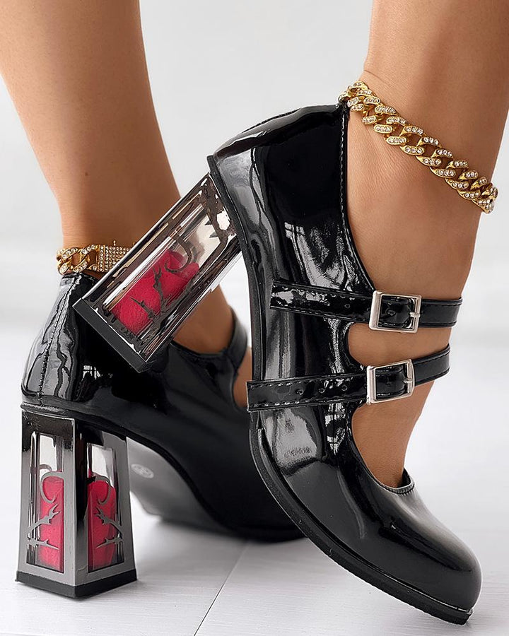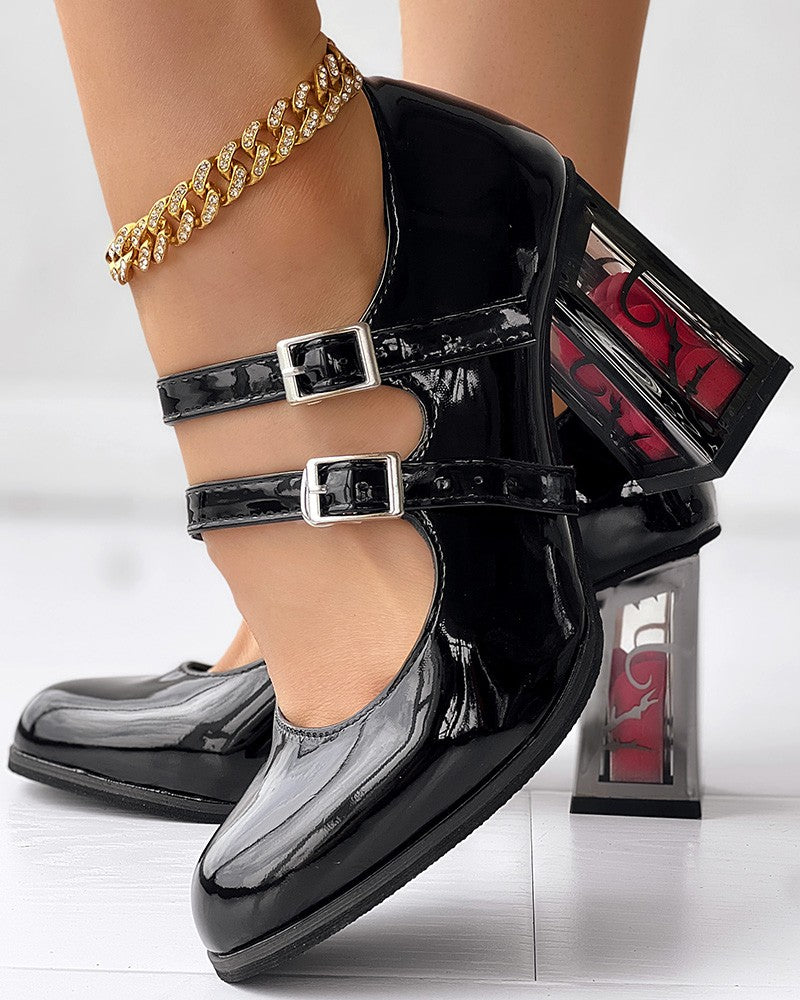 Rose Pattern Buckled Chunky Mary Jane Shoes