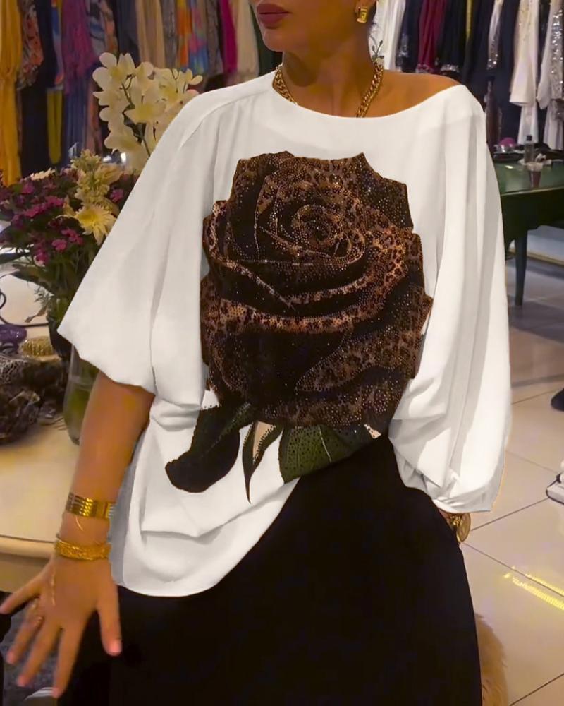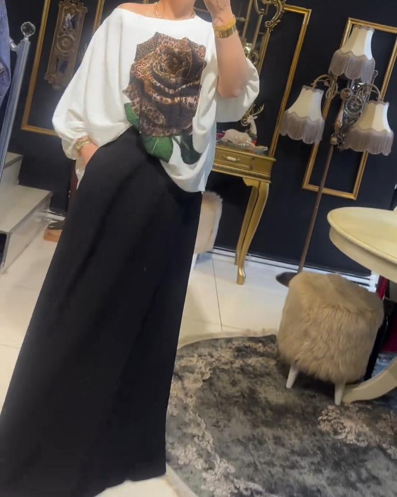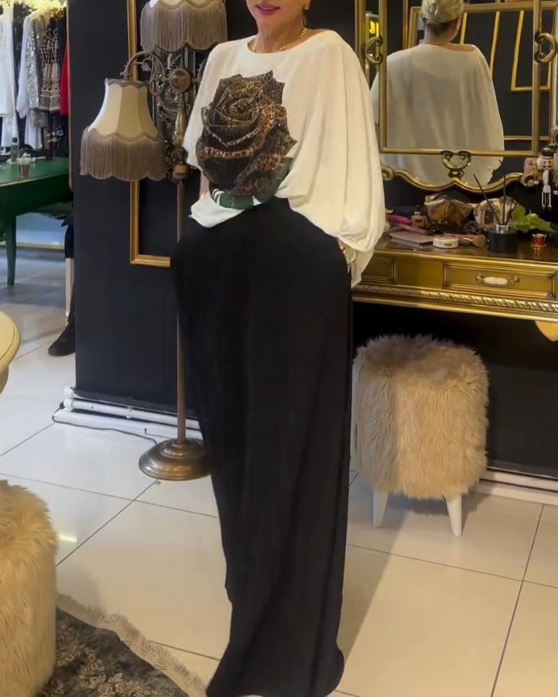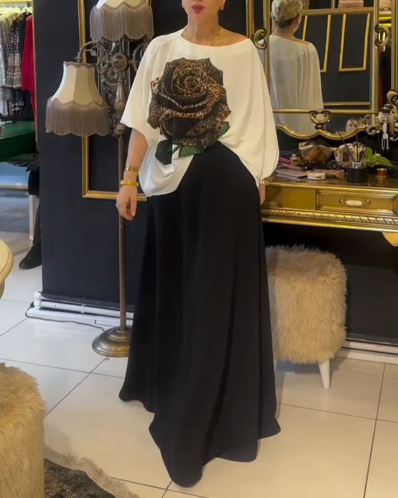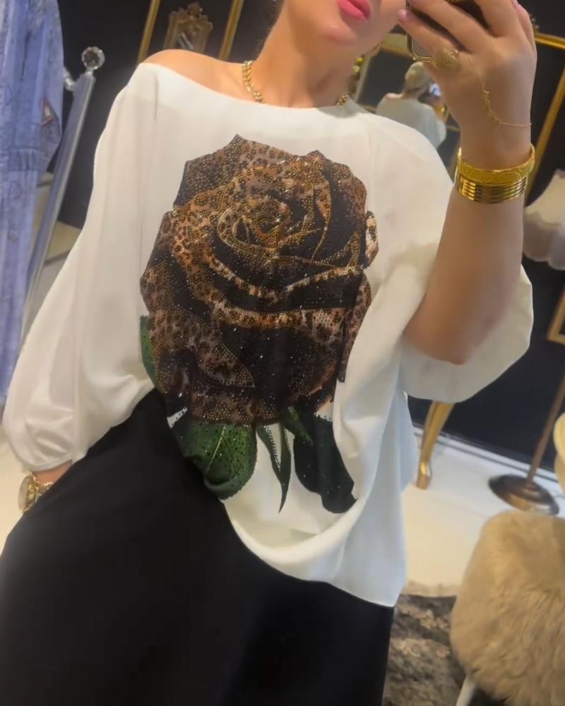 Rose Print Rhinestione Lantern Sleeve Top & Skirt Set