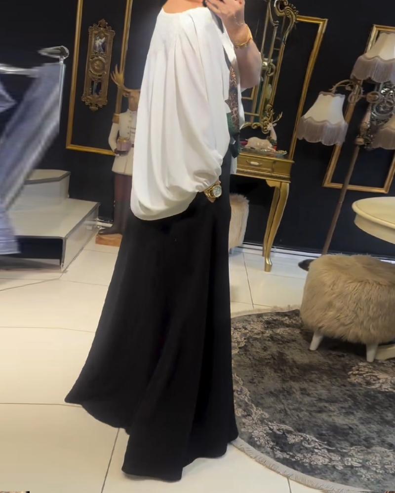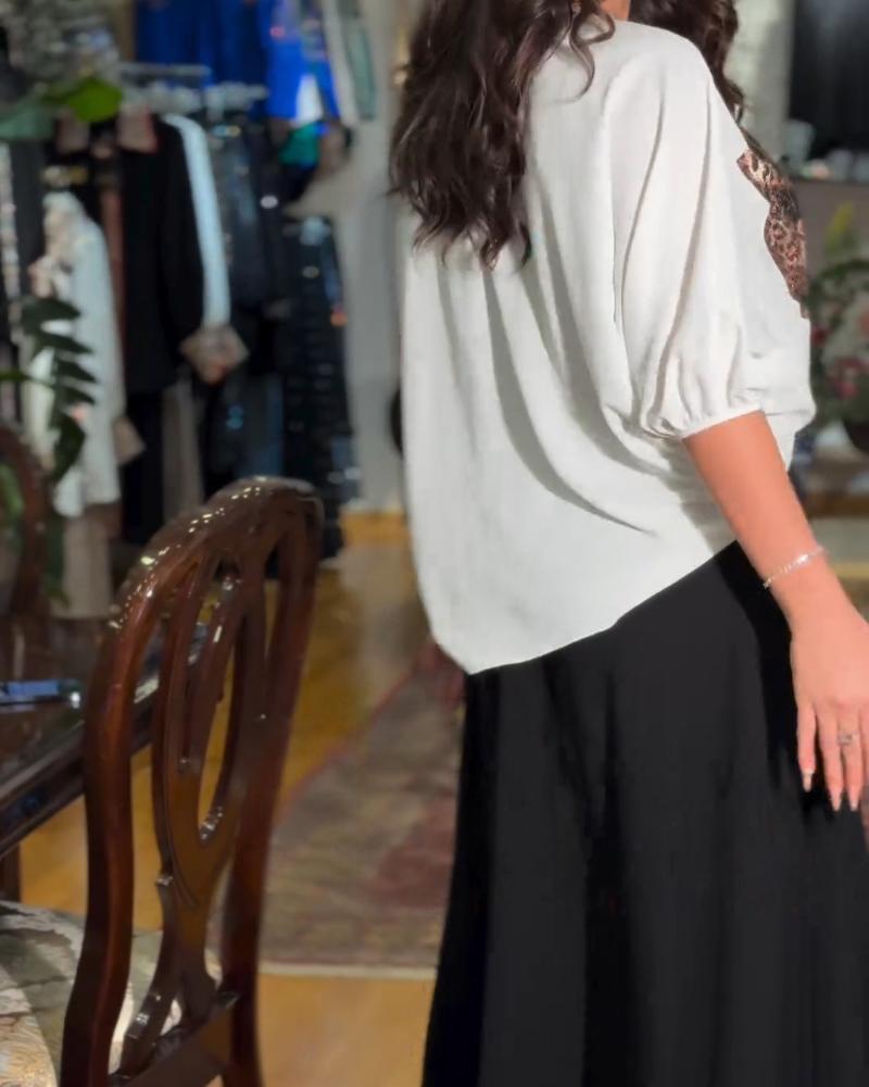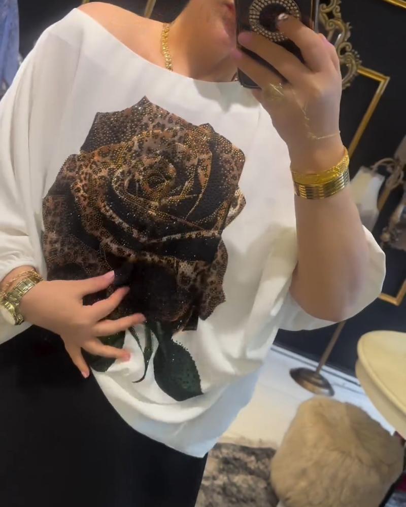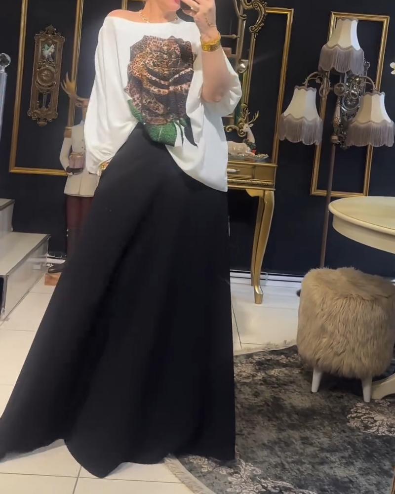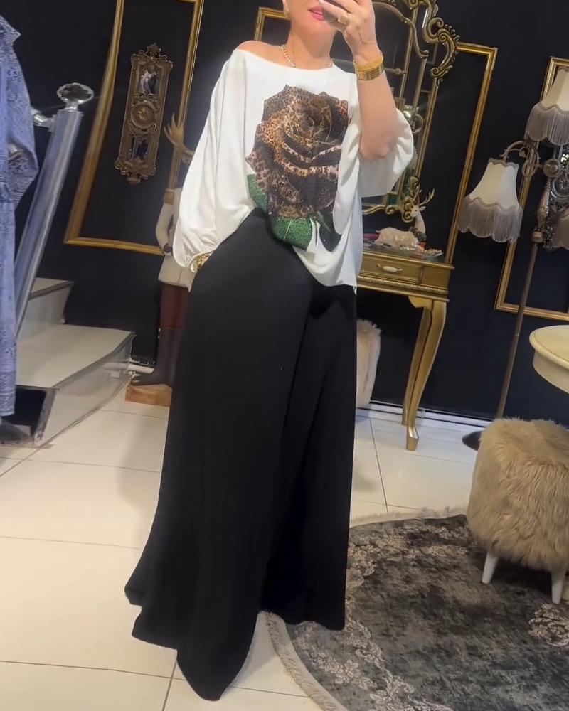 Rose Print Rhinestione Lantern Sleeve Top & Skirt Set
