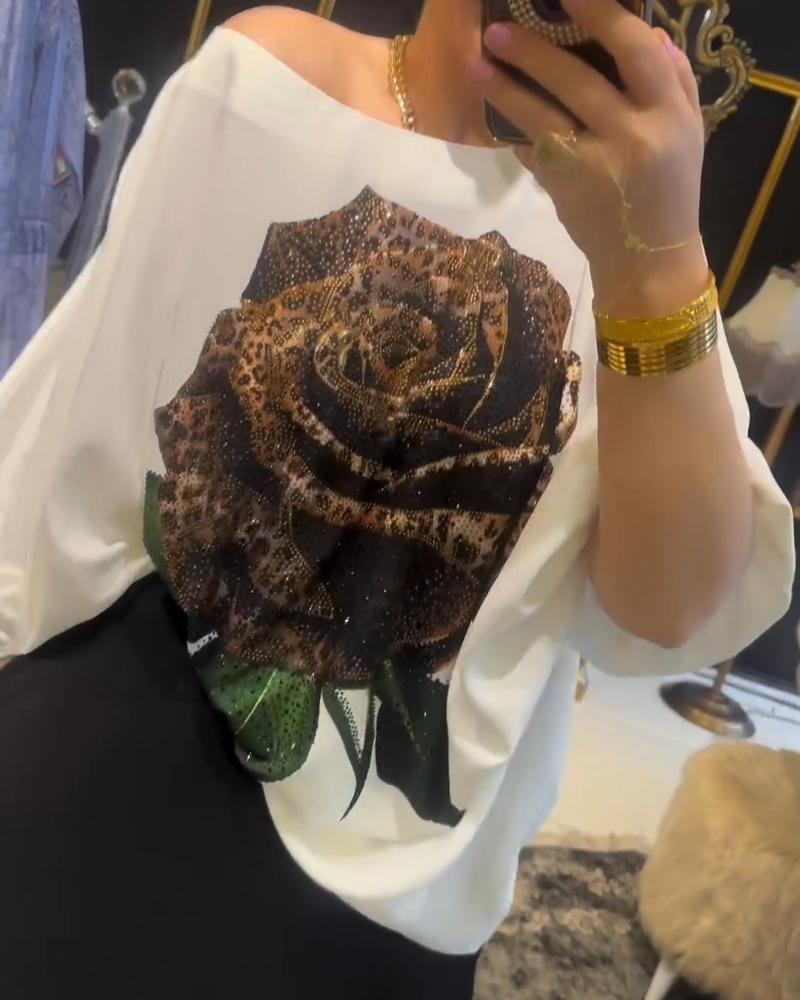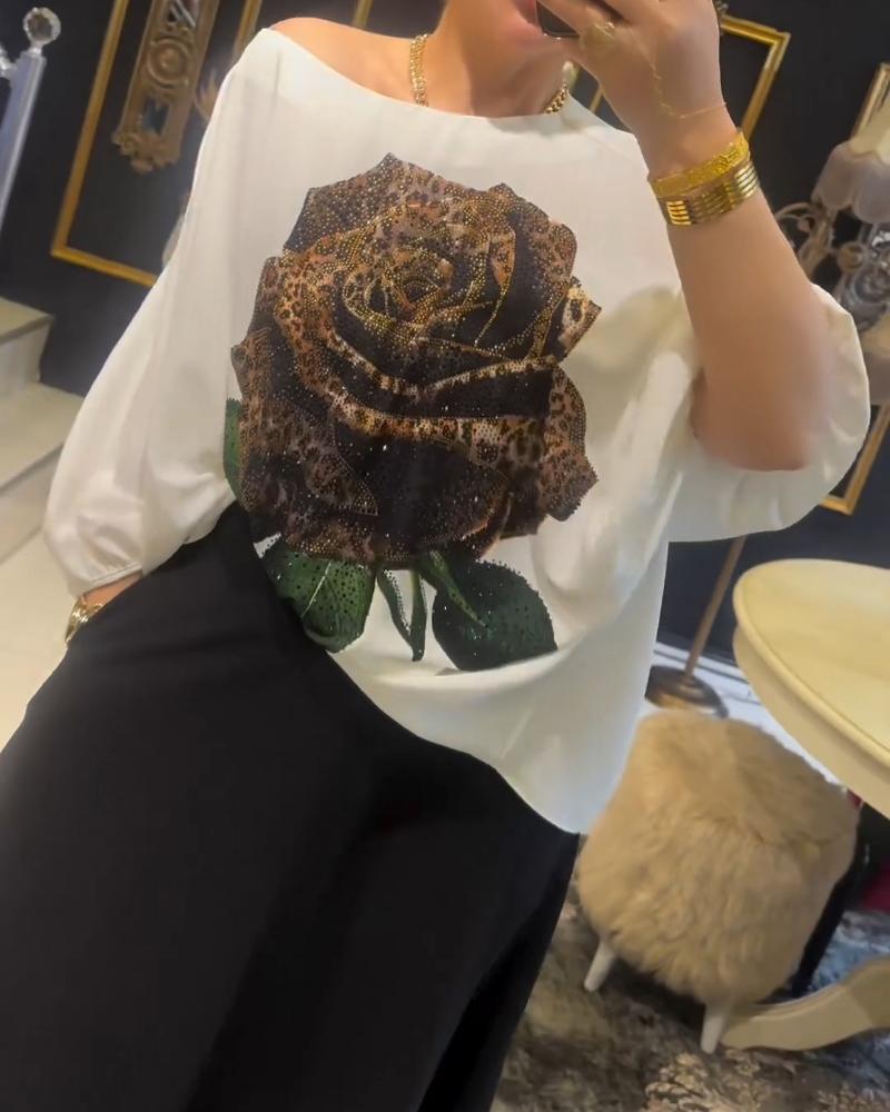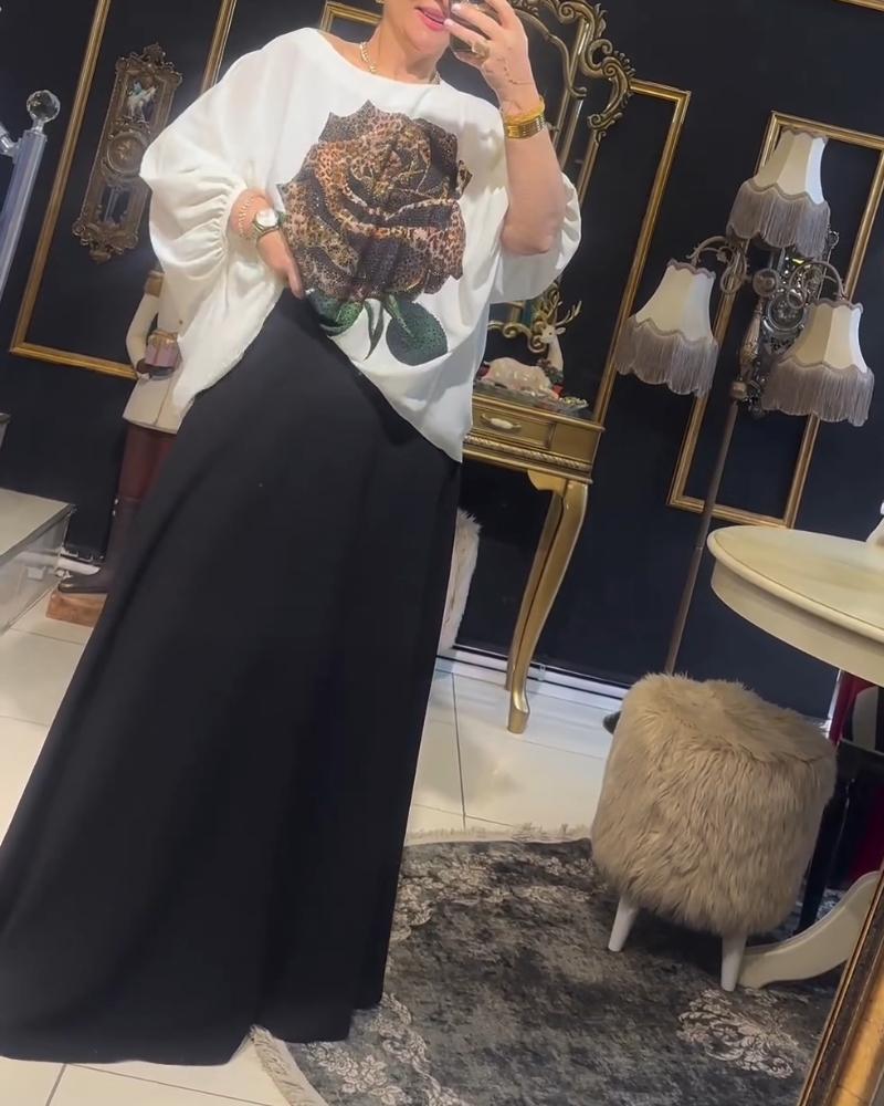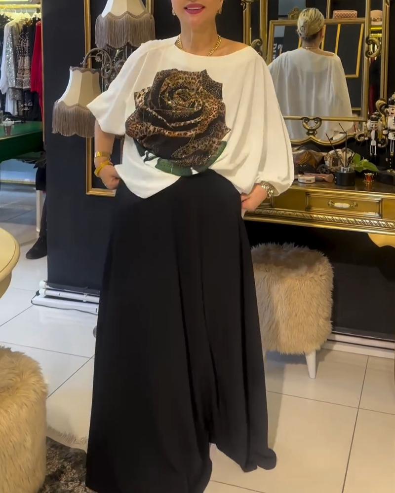 Rose Print Rhinestione Lantern Sleeve Top & Skirt Set