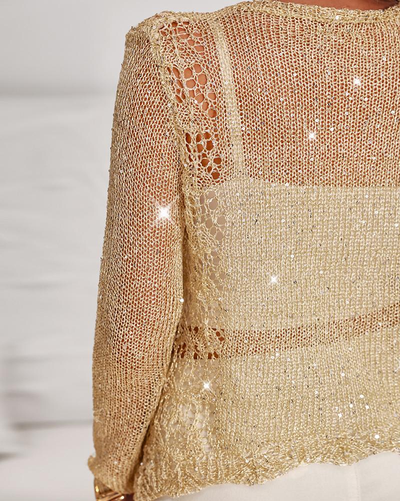 Round Neck Long Sleeve Glitter Crochet Casual Sequin Hollow out Cowl Top