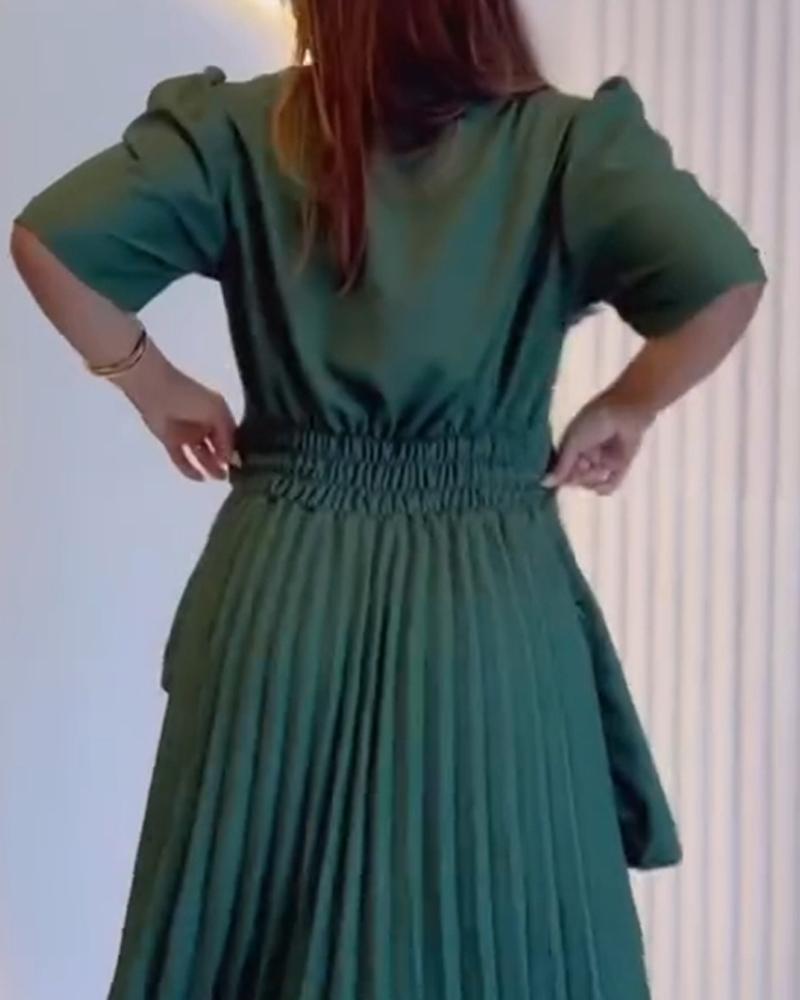 Round Neck Puff Sleeve Pleated Dress Casual Button Decor A Line Waist Dress