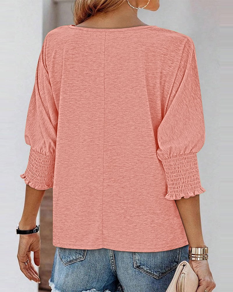 Round Neck Three Quarters Shirred Lantern Sleeve Softy T Shirt Casual Tee